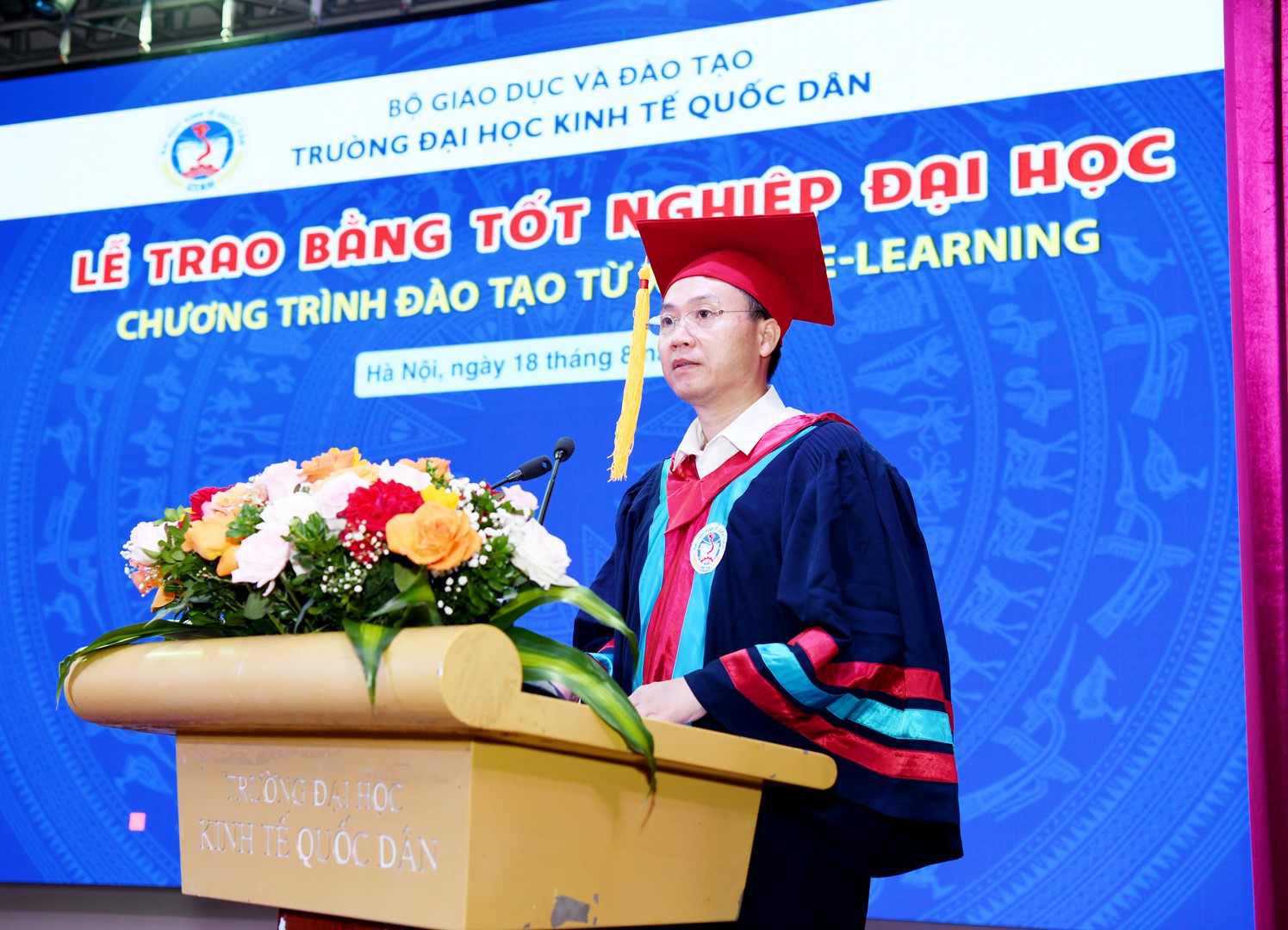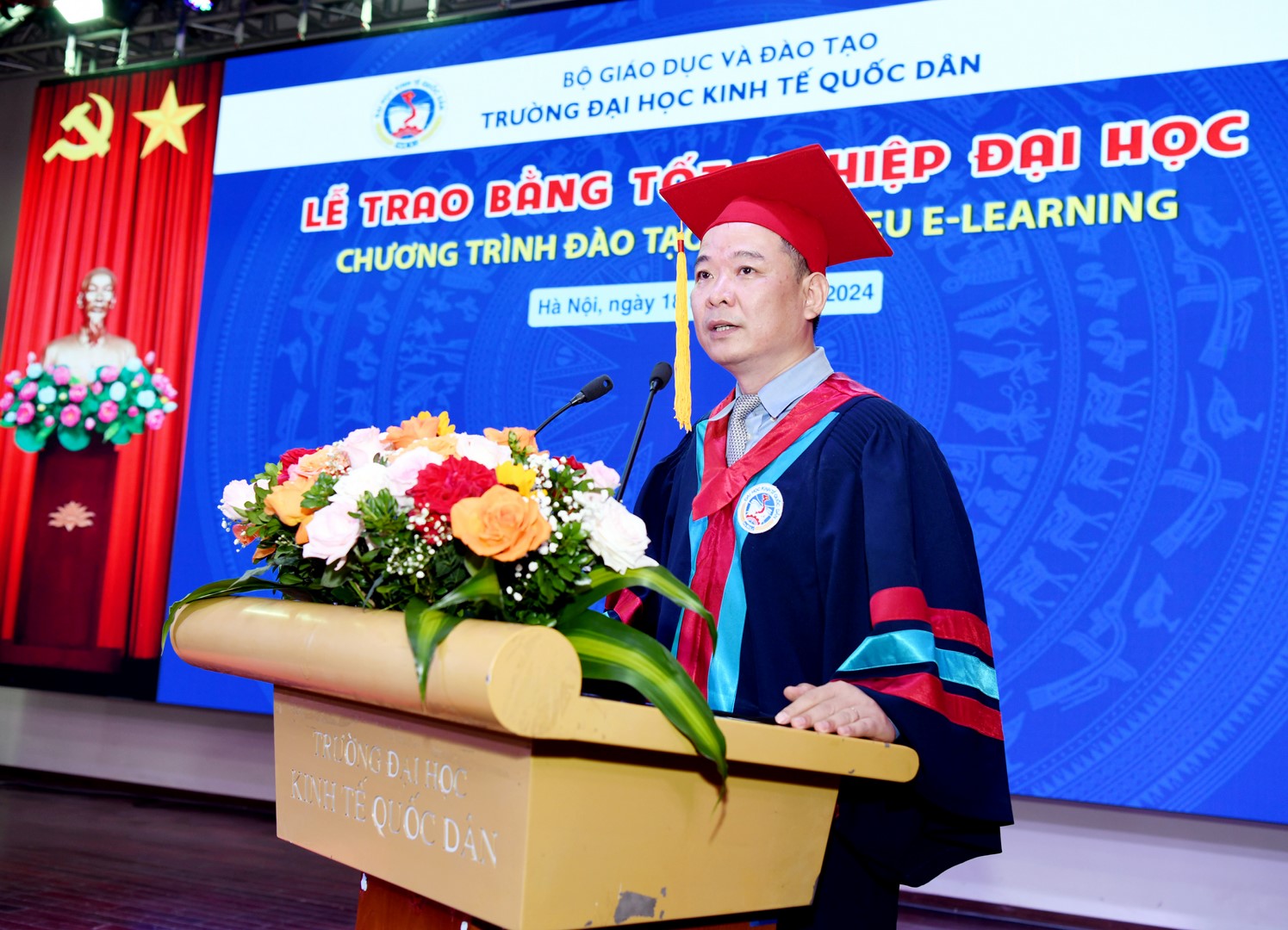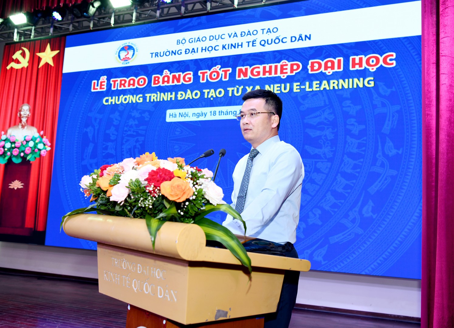 Phát biểu tại buổi lễ, Phó Giáo sư, Phó Hiệu trưởng Bùi Huy Nhượng ghi nhận sự nỗ lực của 226 tân Cử nhân Chương trình Đào tạo từ xa NEU E-learning trong suốt thời gian học tập tại Trường, đồng thời bày tỏ niềm tự hào khi được đồng hành trong suốt chặng đường chinh phục mục tiêu của các tân Cử nhân.