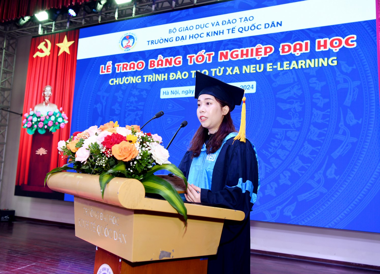 Xúc động phát biểu tại buổi lễ, tân Cử nhân Nguyễn Thị Thanh Tuấn chia sẻ, thật may mắn và tự hào cho chúng em là những sinh viên được học tập theo phương thức E-Learning của Trường Đại học Kinh tế Quốc dân, được là sinh viên của ngôi trường Đại học có bề dày gần 70 năm lịch sử, cùng với đó là một phương thức học tập hiện đại, tạo điều kiện thuận lợi cho sinh viên chúng em được học tập mọi lúc mọi nơi và đây cũng chính là xu hướng chung của thế giới.
