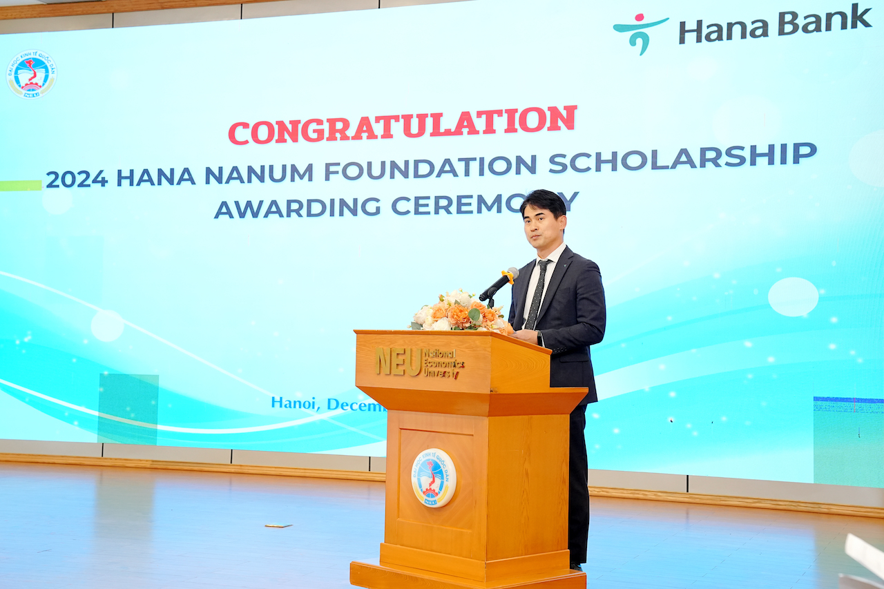 Ông Cho Han Kyu – Tổng Giám đốc Ngân hàng KEB Hana, Chi nhánh Hà Nội bày tỏ niềm vui khi được quay trở lại Đại học Kinh tế Quốc dân, ngôi trường hàng đầu đào tạo về kinh tế, quản lý và quản trị kinh doanh tại Việt Nam. Ông Cho Han Kyu cũng gửi lời chúc mừng tới các bạn sinh viên đã xuất sắc nhận được học bổng HANA Nanum ngày hôm nay.