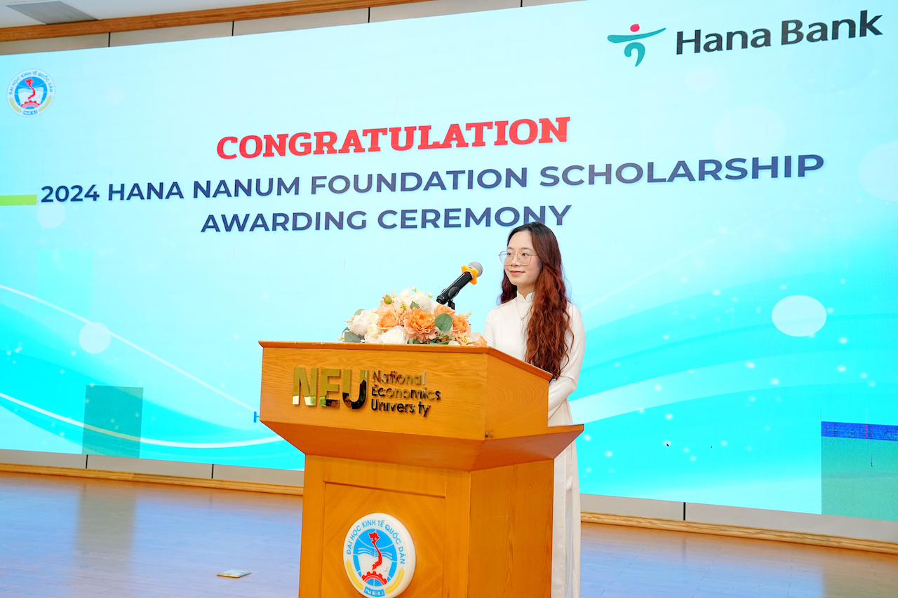 Đại diện cho 30 sinh viên được nhận học bổng HANA Nanum, em Phạm Thị Phương Thảo gửi lời cảm ơn chân thành đến Ngân hàng KEB Hana chi nhánh Hà Nội, Quỹ Hana Nanum và Viện Ngân hàng – Tài chính, Đại học Kinh tế Quốc dân đã tin tưởng và đồng hành cùng các bạn trên hành trình hiện thực hóa ước mơ của mình.