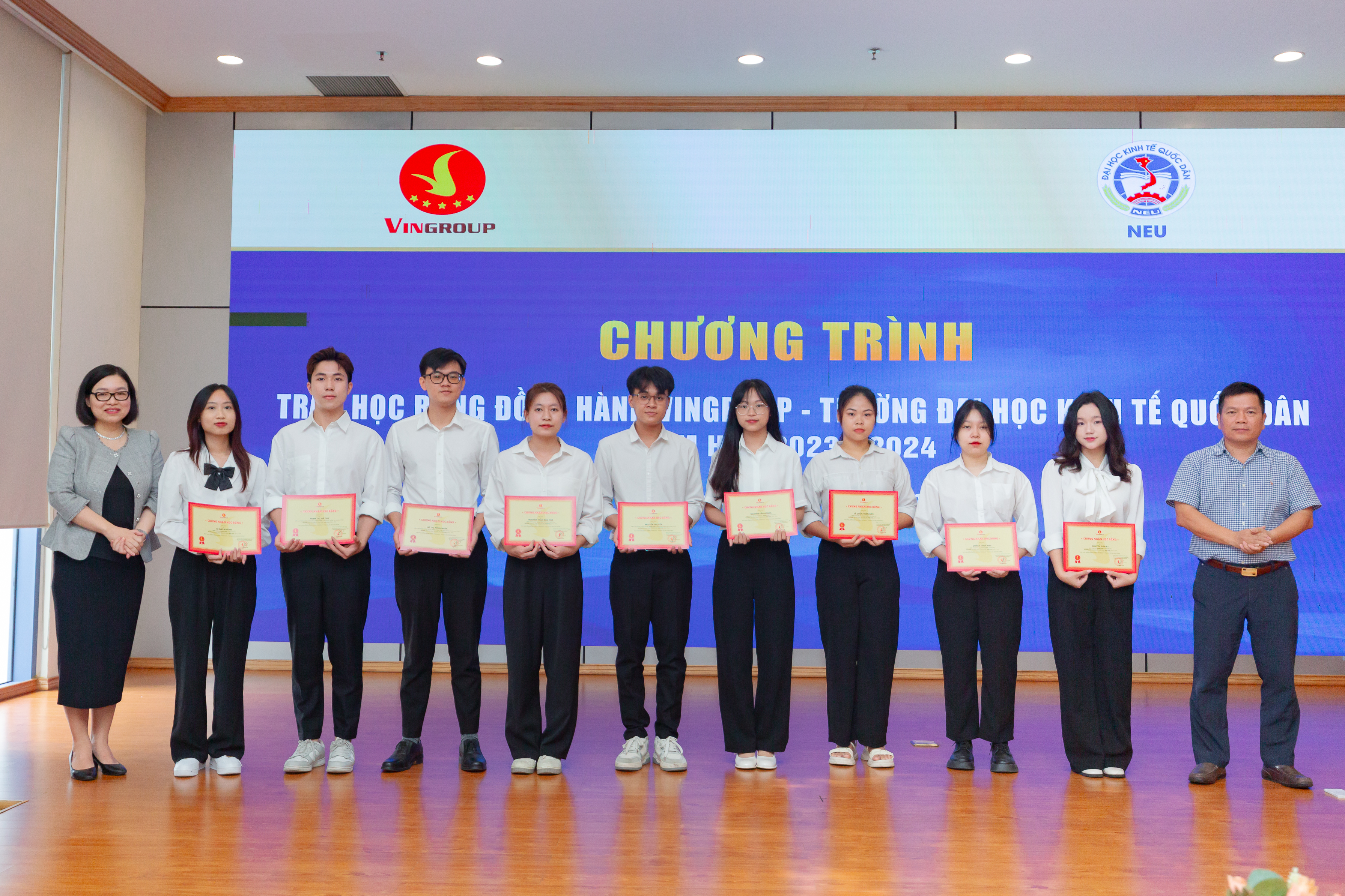 Sáng ngày 30/7/2024, Trường Đại học Kinh tế Quốc dân phối hợp với Trường Đại học VinUni – Công ty TNHH Giáo dục và đào tạo VinAcademy đã trao 39 suất học bổng Đồng hành Vingroup – Đại học Kinh tế Quốc dân, giúp ươm mầm cho các bạn sinh viên có thành tích học tập, nghiên cứu khoa học xuất sắc và đạt thành tích cao trong các cuộc thi học thuật.