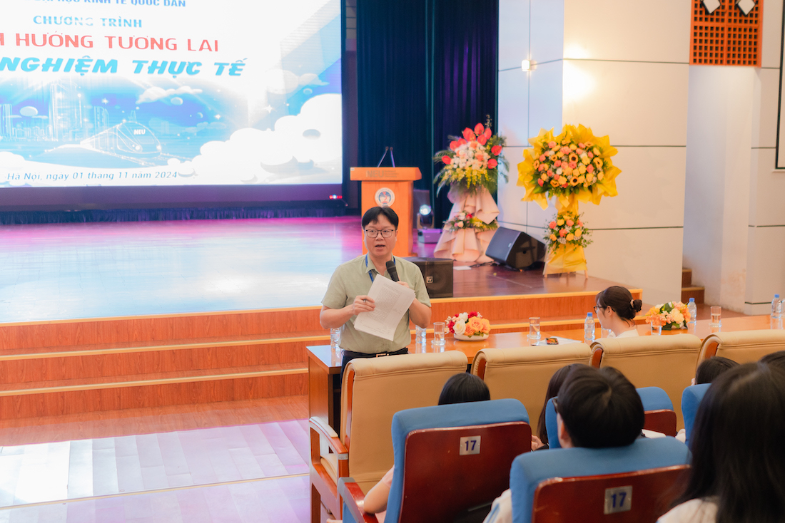 Phát biểu khai mạc chương trình, PGS.TS Bùi Huy Nhượng – Phó Hiệu trưởng chào mừng các thầy cô giáo, các bậc phụ huynh và các em học sinh Trường THPT Chí Linh, tỉnh Hải Dương đã đến tham dự chương trình “Định hướng tương lai – Trải nghiệm thực tế” tại Trường Đại học Kinh tế Quốc dân.