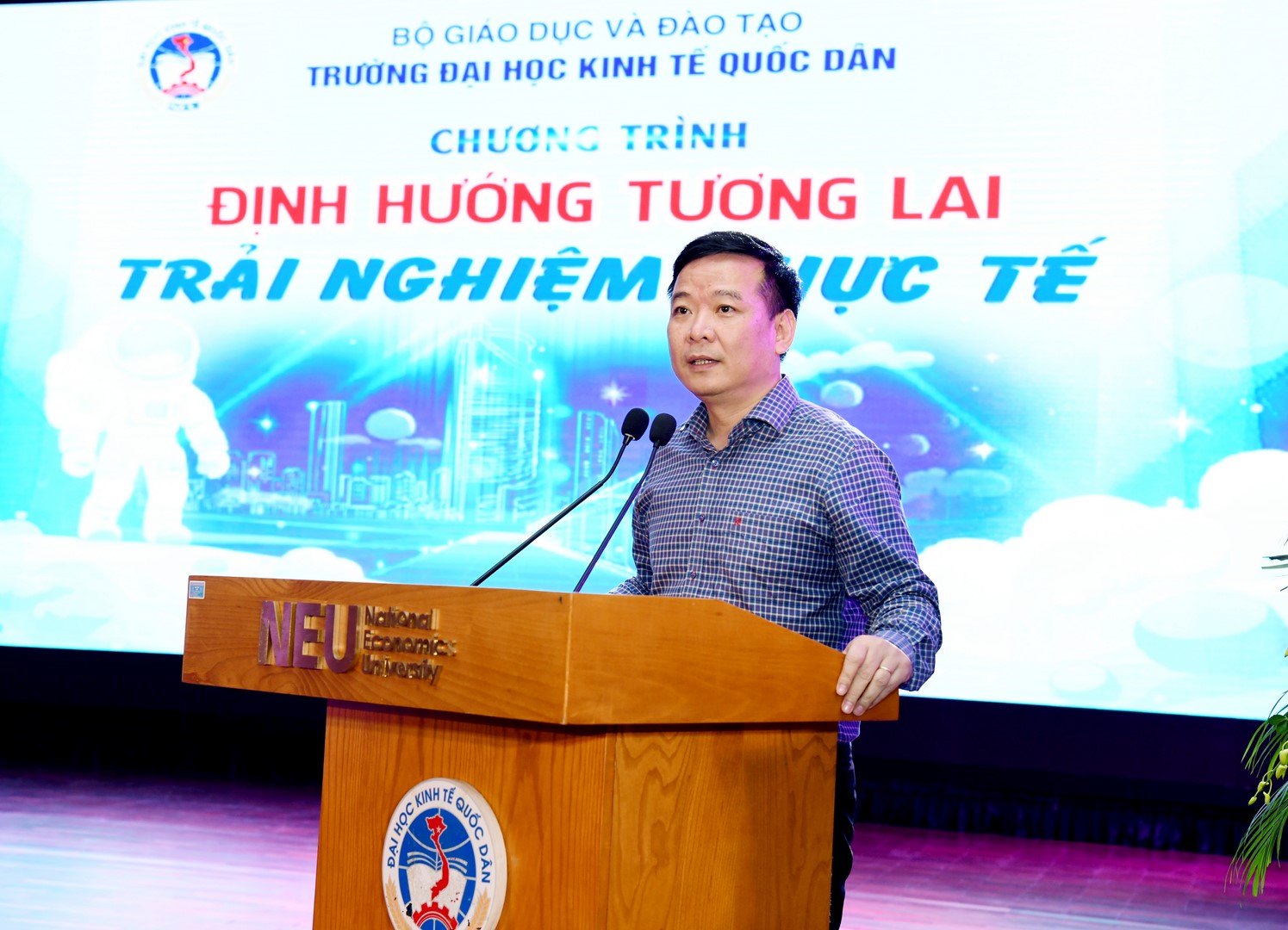 Phát biểu khai mạc chương trình, PGS.TS Bùi Huy Nhượng – Phó Hiệu trưởng chào mừng các thầy cô giáo, các bậc phụ huynh và các em học sinh Trường THPT Chí Linh, tỉnh Hải Dương đã đến tham dự chương trình “Định hướng tương lai – Trải nghiệm thực tế” tại Trường Đại học Kinh tế Quốc dân.