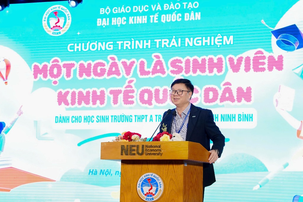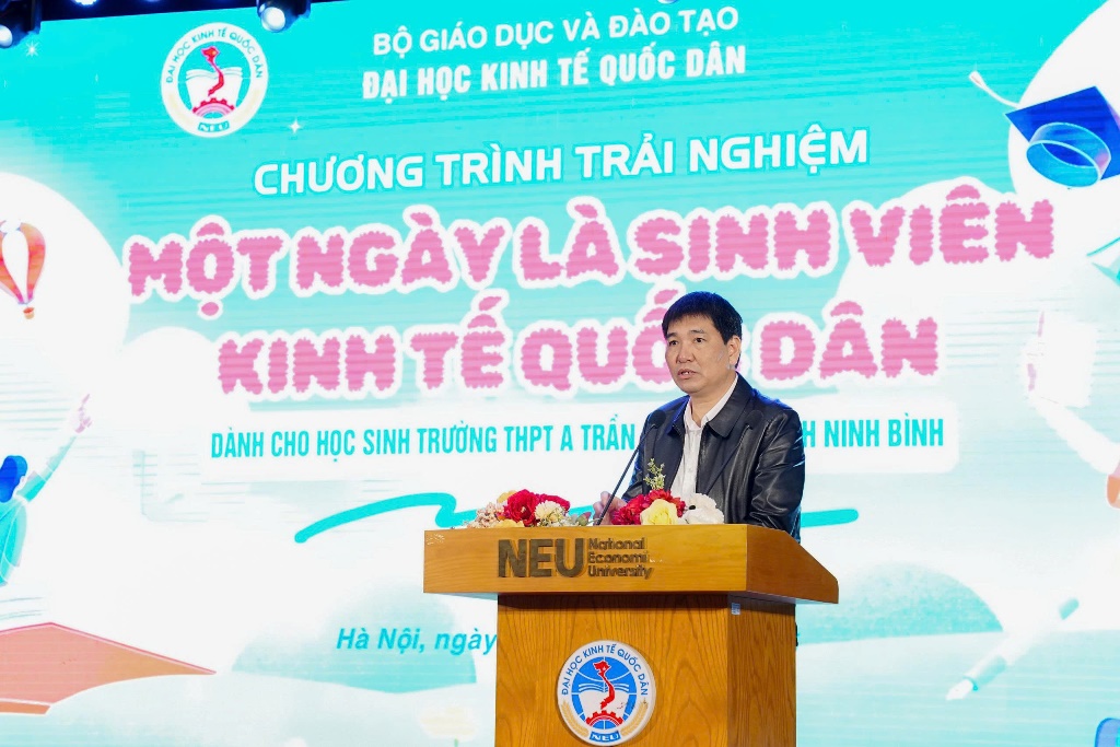 Thay mặt tập thể sư phạm Đại học Kinh tế Quốc dân, TS. Vũ Trọng Nghĩa – Trưởng phòng Truyền thông vui mừng chào đón các thầy cô giáo, các bậc phụ huynh và các em học sinh Trường THPT A Trần Hưng Đạo, tỉnh Ninh Bình đã đến tham quan và trải nghiệm chương trình “Một ngày là sinh viên Kinh tế Quốc dân”.