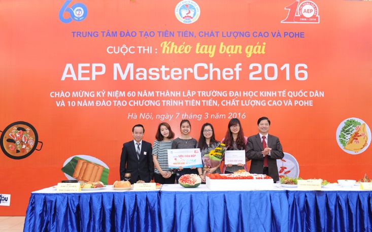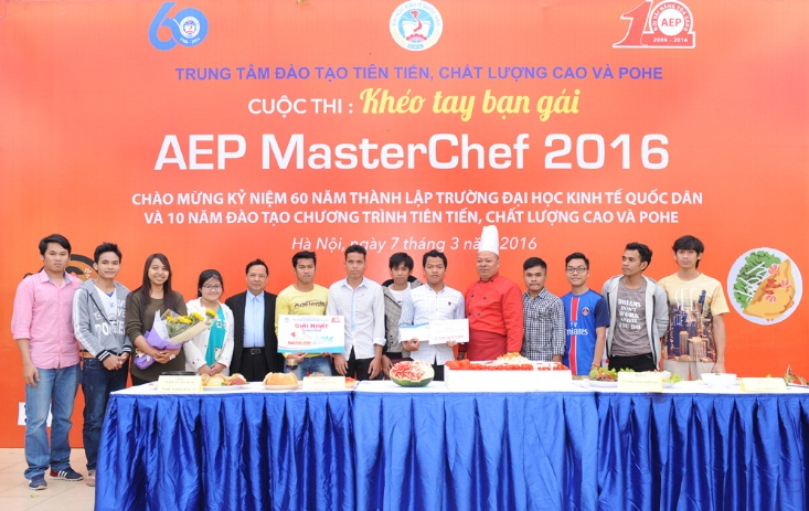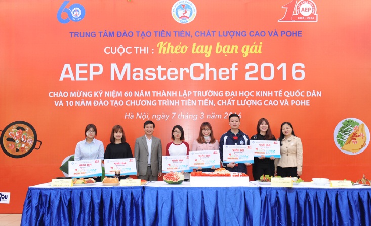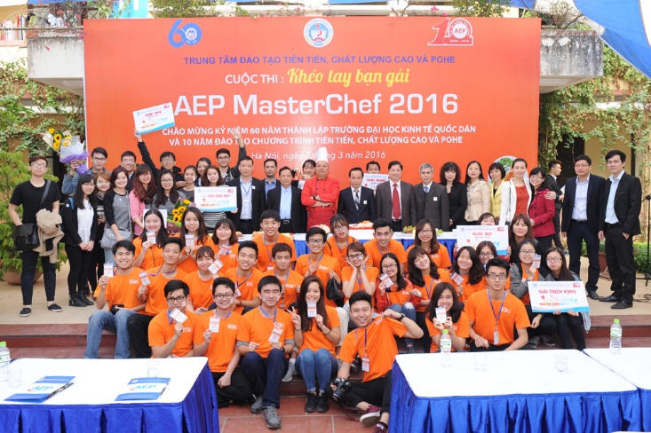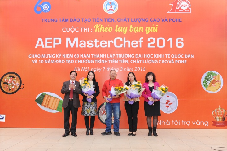 Cuộc thi năm nay đã thu hút được rất nhiều sự chú ý với nhiều đổi mới, không chỉ dừng lại là cuộc thi được tổ chức thường niên dành riêng cho các bạn nữ sinh viên của Trung tâm. Đây cũng là dịp để các thành viên trong gia đình AEP thêm gắn kết, hiểu nhau hơn cũng như có thêm nhiều cơ hội giao lưu kết bạn. Đặc biệt, cuộc thi cũng chính là một sự kiện lớn trong chuỗi sự kiện chào mừng 60 năm thành lập trường Đại học Kinh tế Quốc dân và 10 năm đào tạo chương trình Tiên tiến, Chất lượng cao & POHE. Đến tham dự và động viên các đội thi có GS.TS. Phạm Quang Trung – Phó bí thư Đảng ủy, Phó Hiệu trưởng, Trưởng BQL Chương trình TT, CLC & POHE; GS.TS. Nguyễn Quang Dong – Phó BQL chương trình; TS. Helen Huntley – Giám đốc chương trình đào tạo quốc tế trường ĐH Californa, San Bernardino tại Việt Nam, PGS.TS Bùi Huy Nhượng – Giám đốc Trung tâm Đào tạo Tiên tiến, Chất lượng cao & POHE;TS. Vũ Trọng Nghĩa – Phó trưởng phòng CTCT&QLSV, ThS. Đinh Tuấn Dũng – Phó Giám đốc TT Đào tạo Tiên tiến, CLC & POHE, Th.S. Hồ Quỳnh Anh – Phó trưởng phòng Tổng hợp, TS. Trần Thu Hoài – Phó trưởng ban Nữ công trường, TS. Hoàng Thị Lan Hương – Trưởng BM Quản trị Khách sạn, Th.S Trần Quí Long – Phó bí thư Đoàn trường; Th.S Lâm Tùng – Chủ tịch Hội sinh viên cùng các thầy cô giáo trong Ban quản lý và giảng dạy của Trung tâm. Đặc biệt, AEP MasterChef năm nay hân hạnh có sự đồng hành của các nhà tài trợ: Nhà tài trợ vàng – Trung tâm dạy nấu ăn Sao Mai và nhà tài trợ đồng hành – Gấu Uniform.