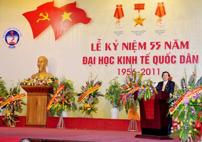 Hôm nay, Trường Đại học KTQD long trọng tổ chức Lễ kỷ niệm 55 năm thành lập Trường (1956-2011) và đón nhận Huân chương Hồ Chí Minh (lần 2) – phần thưởng cao quý mà Đảng và Nhà nước trao tặng cho tập thể sư phạm Nhà trường. Trước hết, cho phép tôi được thay mặt các thế hệ cán bộ, giảng viên, công nhân viên, sinh viên và học viên của Trường Đại học KTQD nhiệt liệt chào mừng và chân thành cảm ơn Chủ tịch nước Trương Tấn Sang cùng các đồng chí lãnh đạo Đảng, Nhà nước và Chính phủ, lãnh đạo Bộ Giáo dục và Đào tạo và các Bộ, ngành TW, các vị khách quý đã có mặt để chia sẻ niềm vui lớn với Trường Đại học KTQD hôm nay. Xin được kính chúc Chủ tịch nước và các đồng chí lãnh đạo Đảng, Nhà nước, Chính phủ, các vị khách quý sức khỏe, thành công và thành đạt.