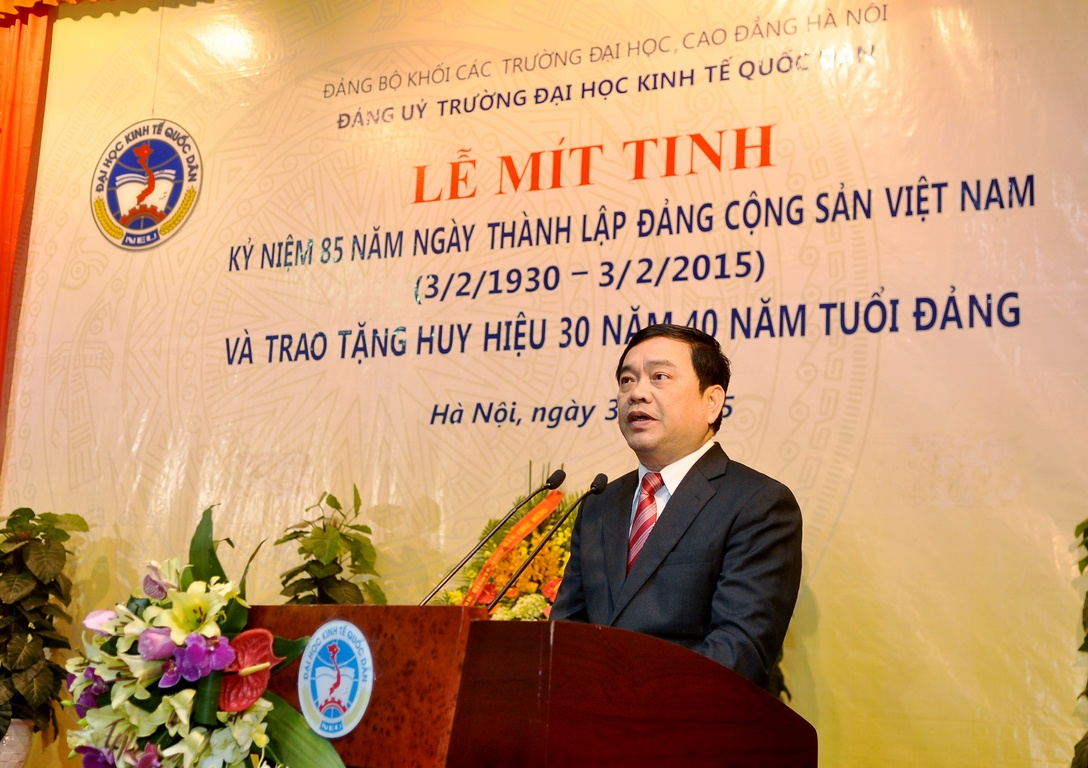 Trong không khí vui tươi, phấn khởi mừng Đảng 85 tuổi, mừng năm mới 2015 và xuân Ất Mùi, xin kính chúc các đồng chí cùng gia đình mạnh khoẻ, hạnh phúc. Chúc các đồng chí đạt nhiều thành tích trong công tác. Chúc Trường Đại học Kinh tế quốc dân thân yêu của chúng ta bước vào giai đoạn phát triển mới với một khí thế mới, gặt hái được nhiều thành công trong sự nghiệp giáo dục và đào tạo, xứng đáng với niềm tin và sự kỳ vọng mà Đảng, Nhà nước và xã hội đang chờ đợi ở chúng ta.