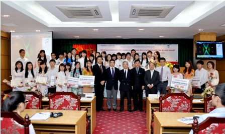 Trước khi bài giảng được bắt đầu, Tập đoàn Sumitomo, đại diện là ngài Funakoshi Toyoaki , Tổng giám đốc Sumitomo Vietnam, trao các suất họcbổng cho 40 sinh viên Trường ĐHKTQD có hoàn cảnh gia đình khó khăn song đã thể hiện nỗ lực, cố gắng và đạt thành tích tốt trong học tập trong năm học 2011-2012.  Ngài Funakoshi Toyoaki đã chúc mừng các sinh viên được nhận học bổng và phát biểu rằng việc trao các suất học bổng này là một phần của các hoạt động trách nhiệm xã hội hàng năm của Tập đoàn Sumitomo, với mục tiêu góp phần xây dựng một xã hội tốt đẹp hơn. Sinh viên Nguyễn Ngọc Anh, đến từ Viện Kế toán – Kiểm toán, đã đại diện các sinh viên nhận học bổng cảm ơn tập đoàn Sumitomo và bày tỏ quyết tâm học tập tốt hơn, nỗ lực hết mình để xứng đáng với các học bổng này.
