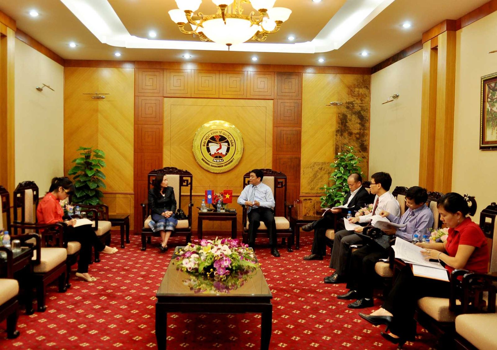 Trong buổi làm việc, TS. Đào Thanh Tùng đã thay mặt trường Đại học Kinh tế Quốc dân báo cáo kết quả tuyển sinh lưu học sinh Lào năm học 2013-2014 và tình hình quản lý lưu học sinh về học tập, ăn ở và sinh hoạt. Nhìn chung, các em lưu học sinh đều chăm ngoan, có ý thức học tập tốt, đạo đức tốt, sống chan hòa với bạn bè, lễ phép với thầy cô. Tuy nhiên, trong quá trình học tập, các em cũng gặp nhiều khó khăn do hạn chế về trình độ tiếng Việt. Để cải thiện tình trạng trên, nhà trường đã tạo điều kiện mở các lớp bồi dưỡng tiếng Việt, tổ chức các hoạt động ngoại khóa, giao lưu cho các em.