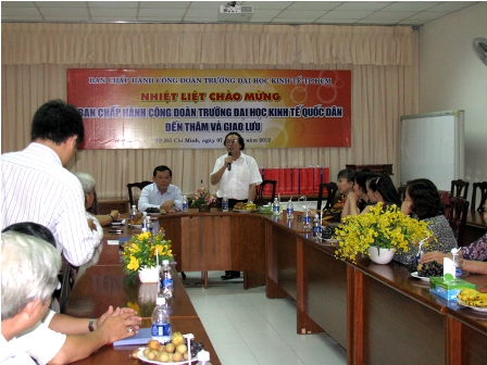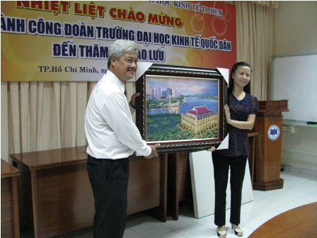 Thực hiện Chương trình công tác công Đoàn năm học  2012, nhằm tăng cường sự gắn kết, giao lưu, học hỏi kinh nghiệm và hợp tác giữa hai Ban chấp hành Công Đoàn –  Đại học Kinh tế quốc dân Hà Nội (ĐHKTQD HN) và Đại học Kinh tế Thành phố Hồ Chí Minh (ĐHKT TP. Hồ Chí Minh), sáng ngày 7 tháng 8 năm 2012 tại Hội trường Trường Kinh tế TP HCM đã diễn ra chương trình “Giao lưu, trao đổi và học tập kinh nghiệm giữa Ban chấp hành Công đoàn – Đại học Kinh tế quốc dân Hà Nội và Đại học Kinh tế Thành phố Hồ Chí Minh”. Cùng tham dự buổi giao lưu các đại biểu vô cùng phấn khởi bởi sự hiện diện của  GS.TS. Nguyễn Văn Nam – Hiệu trưởng, Bí thư ĐU trường ĐHKTQD và GS.TS. Nguyễn Đông Phong – Hiệu trưởng, Bí thư ĐU trường ĐH Kinh tế TP. HồChí Minh. Tại buổi giao lưu, GS.TS. Nguyễn Văn Nam và GS.TS. Nguyễn Đông Phong đã phát biểu về ý nghĩa cao cả của cuộc giao lưu và đánh giá cao những những nét đẹp, những thành tích mà BCH Công đoàn 2 trường đã đạt được trong lĩnh vực chuyên môn cũng như hoạt động Công đoàn. Có thể nói sự hiện diện của lãnh đạo 2 trường chính là thể hiện sự quan tâm sâu sắc của Chính quyền  tới hoạt động của Công đoàn nói riêng và sự phát triển của 2 Trường nói chung .