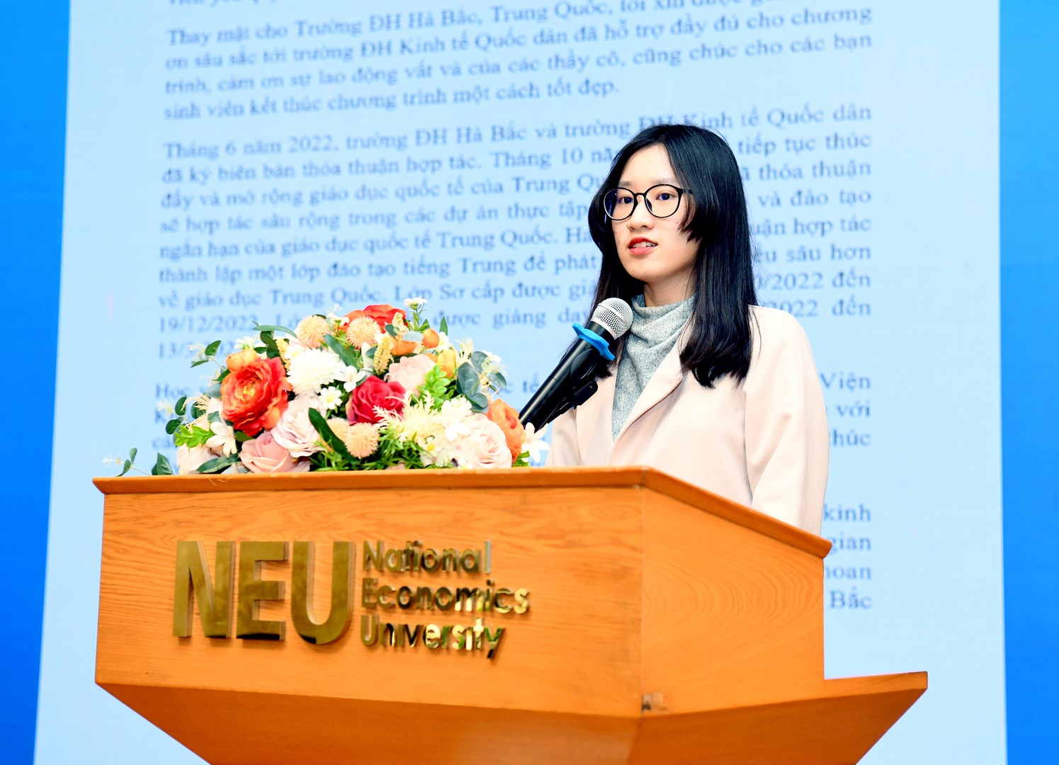 Thay mặt lãnh đạo Trường, TS. Đào Thanh Tùng – Trưởng phòng Hợp tác quốc tế gửi lời cảm ơn đến Trường Đại học Hà Bắc, Trung Quốc đã giúp đỡ sinh viên Đại học Kinh tế Quốc dân có được cơ hội để học hỏi tiếng Trung và tìm hiểu về văn hóa Trung Quốc; đồng thời cảm ơn các thầy cô giáo, các cán bộ phụ trách chương trình của Trường Đại học Kinh tế Quốc dân đã hỗ trợ để chương trình được thực hiện tốt nhất trong 4 tháng vừa qua.