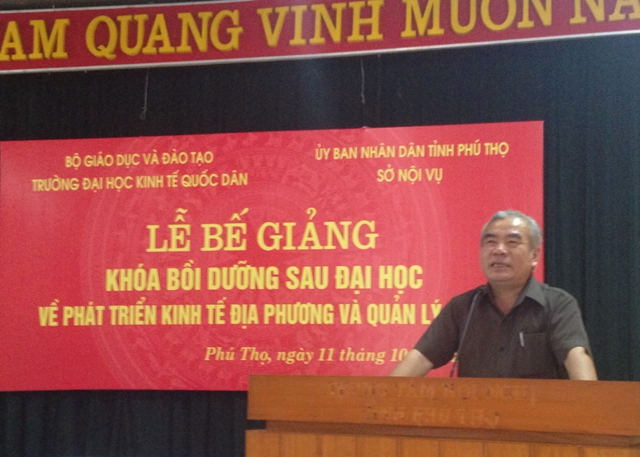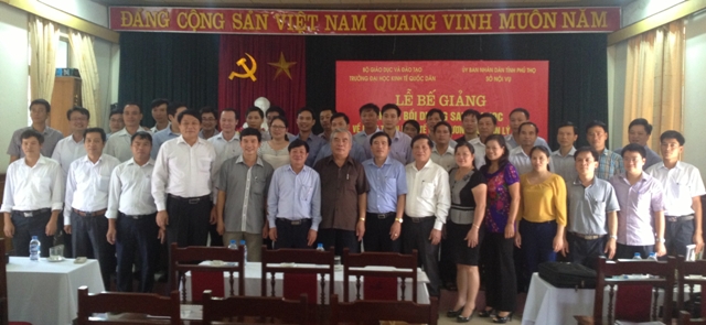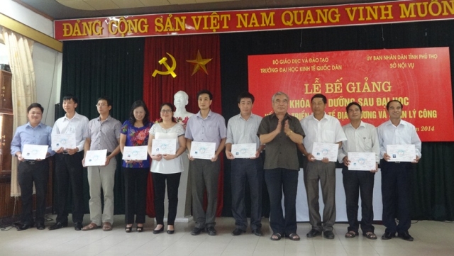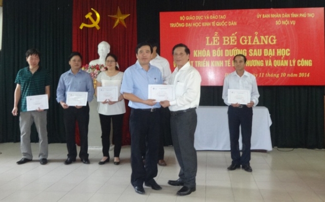 Ngày 11/10/2014 Viện Đào tạo Quốc tế Trường Đại học Kinh tế Quốc dân phối hợp với UBND và Sở Nội vụ tỉnh Phú Thọ đã tổ chức lễ bế giảng khóa đào tạo sau đại học về Phát triển kinh tế địa phương và Quản lý công tại Trung tâm hội nghị tỉnh Phú Thọ. Sau 6 tuần học tập trung, 50 học viên đã hoàn thành chương trình theo kế hoạch, đạt mục đích yêu cầu đề ra và đã được nhận chứng chỉ bồi dưỡng sau đại học của Trường ĐHKTQD do GS. TS. Phan Công Nghĩa, Phó Hiệu trưởng trao. 06 học viên được GS. TS. Hoàng Văn Hoa trao phần thưởng về thành tích học tập tốt và đóng góp tích cực cho sự thành công của khóa học.