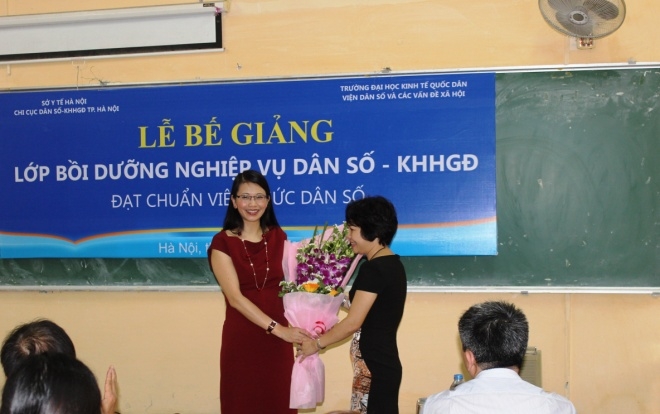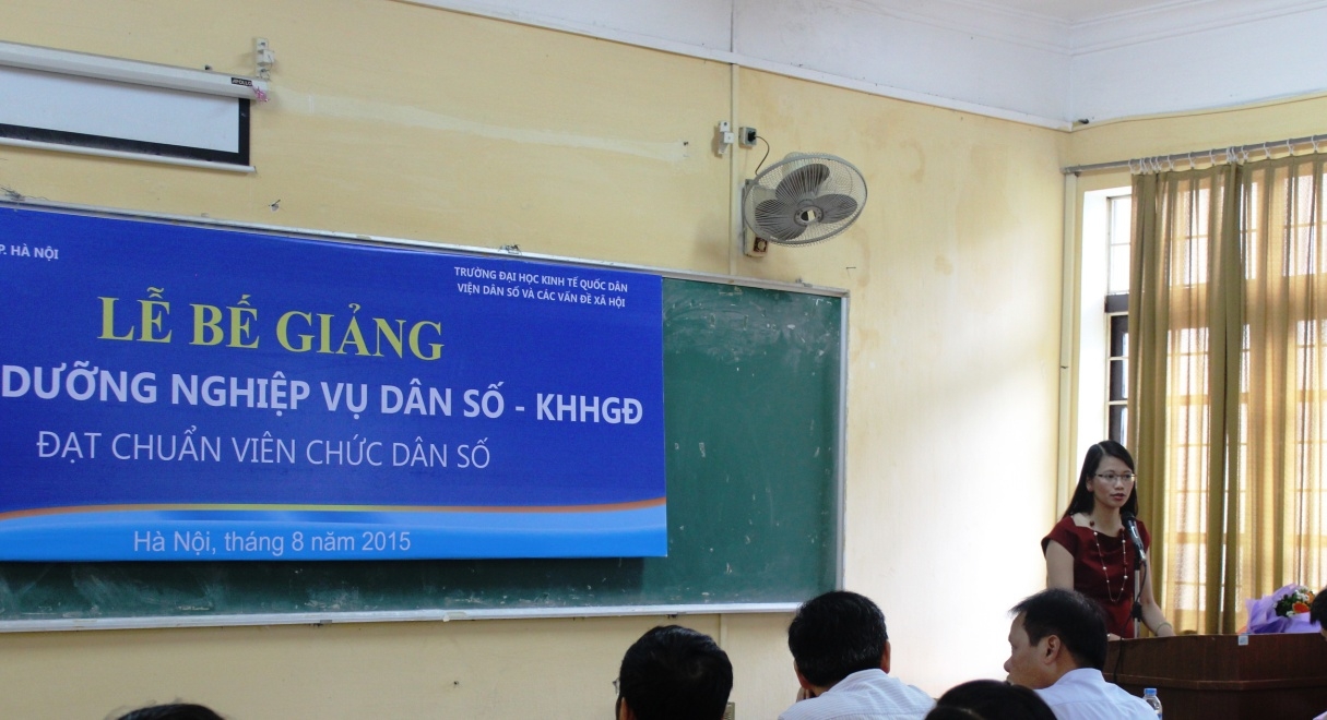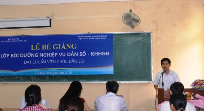 Được sự đồng ý của lãnh đạo Tổng cục Dân số – KHHGĐ, Bộ Y tế, của lãnh đạo Trường ĐH KTQD, sau 3 tháng học tập sôi nổi, khẩn trương, lớp bồi dưỡng kiến thức Dân số-KHHGĐ đạt chuẩn viên chức dân số do Viện Dân số và các vấn đề xã hội phối hợp với Chi cục Dân số-KHHGĐ thành phố Hà Nội tổ chức đã hoàn thành chương trình học tập; và ngày 05/8/2015, tại Viện Dân số và các vấn đề xã hội đã diễn ra lễ bế giảng khóa học. Tới dự buổi lễ, về phía Tổng cục Dân số-KHHGĐ có ông Đỗ Hồng Anh – Trưởng phòng Đào tạo – Vụ Tổ chức cán bộ. Về phía Chi cục DS-KHHGĐ thành phố Hà Nội có ông Tạ Quang Huy – Chi cục trưởng, ông Nguyễn Đình Lân – Phó chi cục trưởng. Về phía Trường ĐH Kinh tế quốc dân có PGS.TS. Nguyễn Thanh Hà – Trưởng phòng Tổ chức Cán bộ, PGS.TS. Lưu Bích Ngọc – Viện trưởng Viện Dân số và các vấn đề xã hội cùng sự hiện diện của đại diện lãnh đạo các phòng ban của Chi cục, các giảng viên và toàn thể 75 học viên là cán bộ viên chức dân số của các xã/phường/thị trấn.