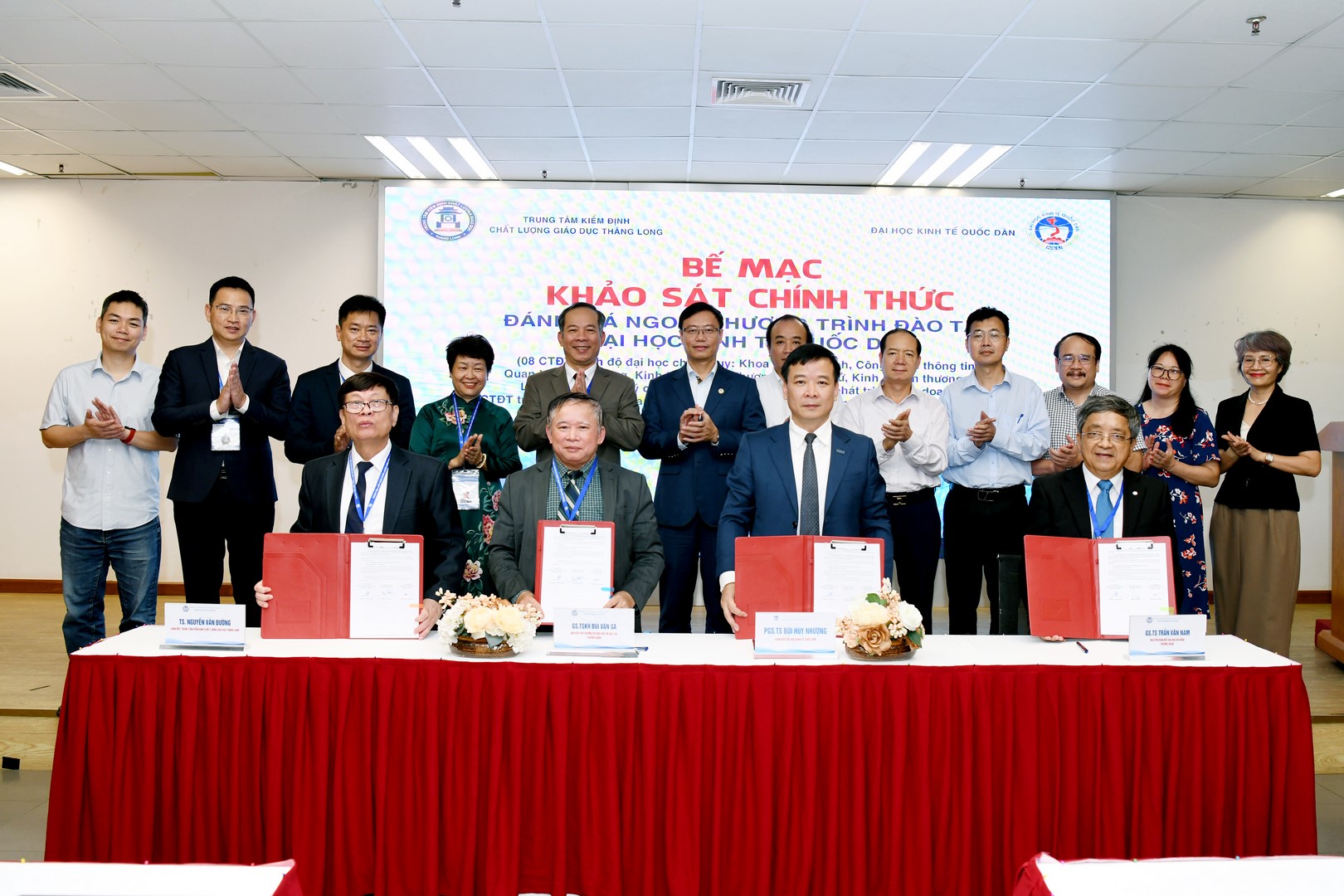 Kết thúc phiên bế mạc, GS.TSKH. Bùi Văn Ga – Nguyên Thứ trưởng Bộ Giáo dục và Đào tạo, Trưởng đoàn Đánh giá ngoài các chương trình đào tạo từ xa, GS.TS Trần Văn Nam – Nguyên Giám đốc Đại học Đà Nẵng, Trưởng đoàn Đánh giá ngoài các chương trình đào tạo chính quy, TS. Nguyễn Văn Đường – Giám đốc Trung tâm Kiểm định chất lượng giáo dục Thăng Long và PGS.TS Bùi Huy Nhượng – Giám đốc Đại học Kinh tế Quốc dân đã ký Biên bản hoàn thành đợt khảo sát chính thức 12 ngành đào tạo của Nhà trường.