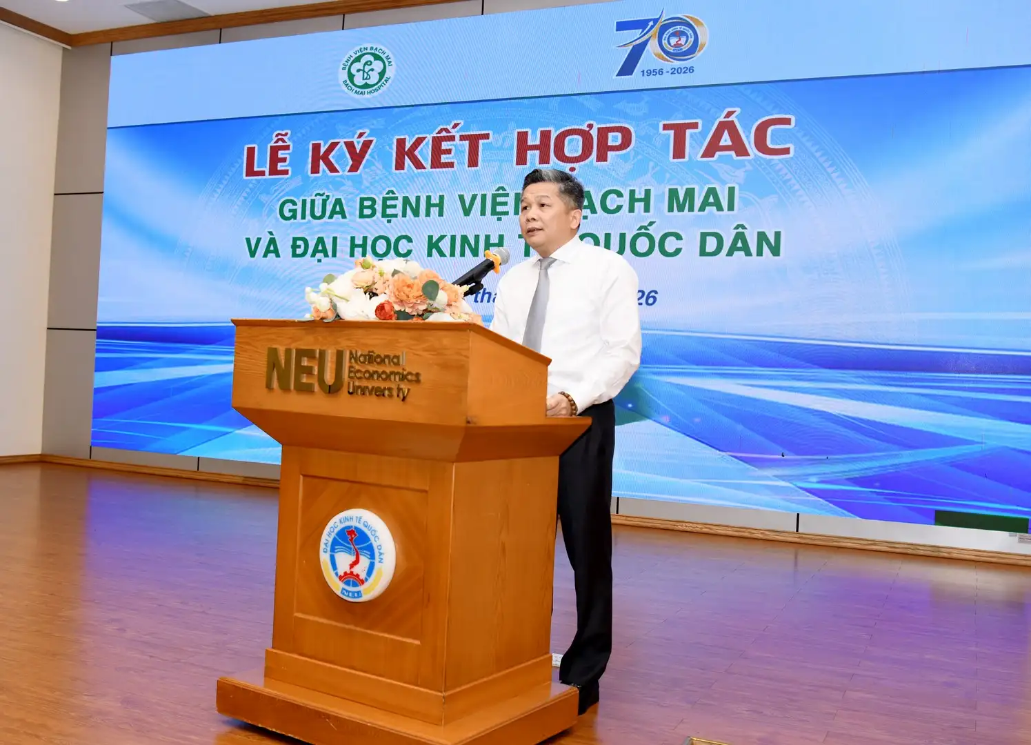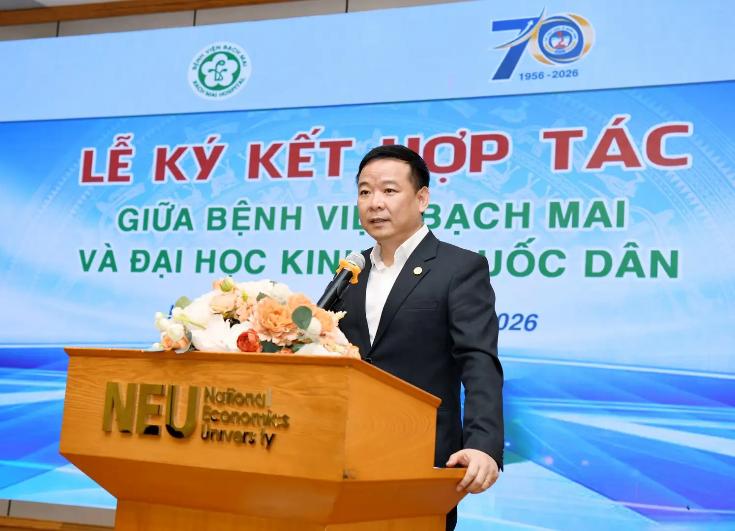 Phát biểu tại buổi lễ, PGS.TS Đào Xuân Cơ – Giám đốc Bệnh viện Bạch Mai nhấn mạnh: “Trong quan điểm phát triển hiện nay, chăm sóc sức khỏe nhân dân không thể chỉ là nhiệm vụ của riêng ngành y, mà cần được kết nối mạnh mẽ hơn với cộng đồng và các lực lượng xã hội. Việc Bệnh viện Bạch Mai và Đại học Kinh tế Quốc dân ký kết hợp tác hôm nay là rất cần thiết, đúng thời điểm và có tầm nhìn dài hạn, nhằm phát huy thế mạnh của hai bên trong đào tạo, nghiên cứu khoa học, truyền thông, quản trị và chăm sóc sức khỏe cộng đồng.”