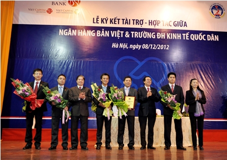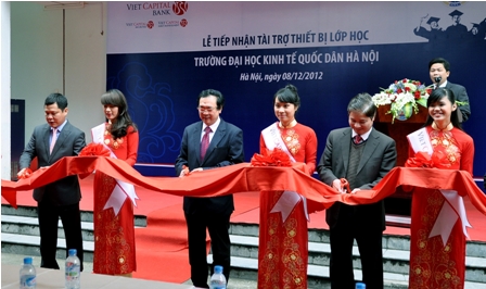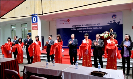 Sáng 8/ 12, trường ĐHKTQD đã tổ chức Lễ cắt băng khánh thành 5 phòng học hiện đại  – tầng 4 giảng đường D, có tổng giá trị 800 triệu đồng,  tiếp nhận 200 triệu đồng học bổng cho 500 sinh viên và ký kết thoả thuận hợp tác toàn diện với Ngân hàng TM CP  Bản Việt.