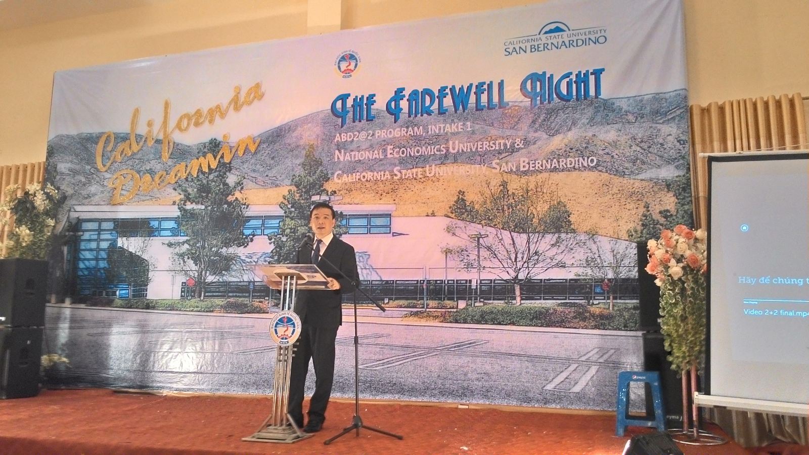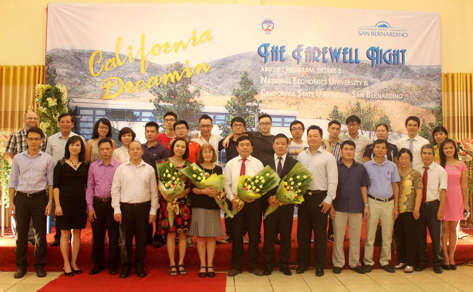 Vừa qua, Trung tâm Đào tạo Tiên tiến, Chất lượng cao và POHE đã tổ chức chia tay sinh viên Chương trình 2@2 khóa 1 lên đường sang California, Hoa Kỳ để hoàn thành nốt chặng đường 2 năm còn lại. Chương trình du học Mỹ ABD2@2 là chương trình hợp tác giữa Đại học Kinh tế Quốc dân và Đại học California, San Bernardino, Hoa Kỳ theo phương thức 2+2 (2 năm tại học tại Đại học KTQD và 2 năm còn lại học tại San Bernardino). Đến dự buổi lễ có sự hiện diện của GS.TS Trần Thọ Đạt, Hiệu trưởng nhà trường, PGS.TS Bùi Huy Nhượng – Giám đốc Trung tâm đào tạo Tiên tiến, Chất lượng cao & POHE, Ths. Đinh Tuấn Dũng – Phó Giám đốc Trung tâm đào tạo Tiên tiến, Chất lượng cao & POHE, PGS.TS Phạm Trương Hoàng – Trưởng Phòng Hợp tác Quốc tế, TS Đào Thanh Tùng, Phó trưởng Phòng Hợp tác Quốc tế, Th.S Đỗ Xuân Dũng – Trưởng Phòng Thanh tra – Pháp chế, PGS.TS Lê Trung Thành – Giám đốc trung tâm đào tạo từ xa, Ths. Tạ Mạnh Thắng –Phó trưởng phòng khảo thí và đảm bảo chất lượng giáo dục, TS. Tô Thiên Hương – Phó trưởng khoa Bảo hiểm. Về phía trường đại học San Bernardino có Giám đốc Chương trình 2@2 tại Việt Nam – GS.TS Helen Huntley cùng toàn thể các thầy cô đại diện cho các Phòng, Ban, Viện, Khoa trong trường, các vị phụ huynh của 3 khóa và đông đảo các bạn sinh viên của Chương trình AEP.