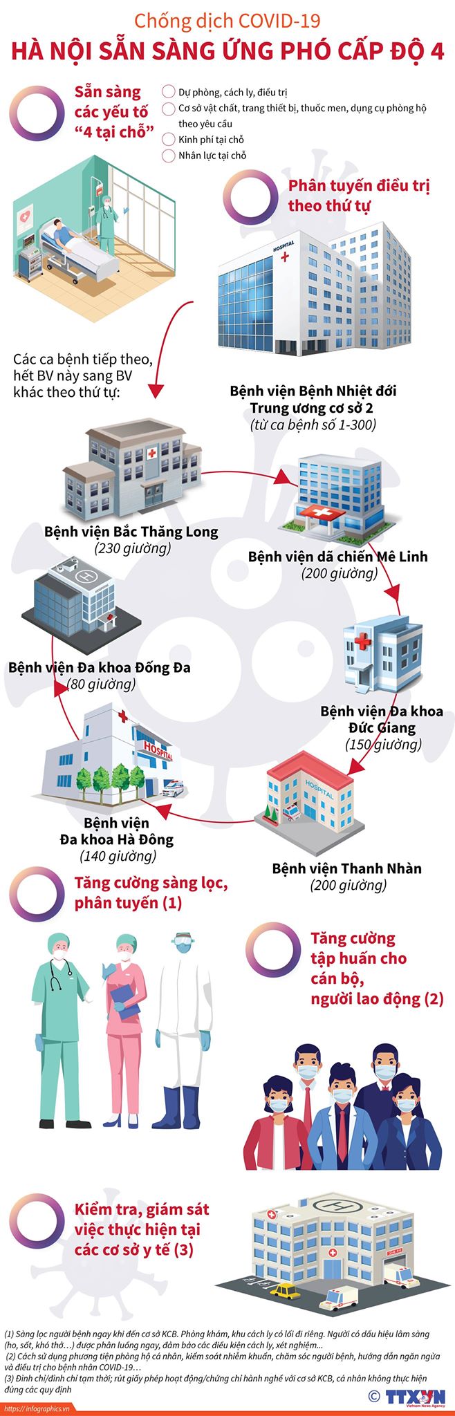 Hà Nội đã chuẩn bị kịch bản ứng phó với cấp độ 4 của dịch COVID-19, theo phương châm “4 tại chỗ”, đảm bảo nhân lực tham gia điều trị được tập huấn phác đồ điều trị, chuyên môn.