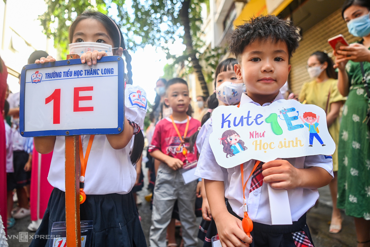 Học sinh lớp 1, trường Tiểu học Thăng Long, quận Hoàn Kiếm, Hà Nội, cầm bảng lớp trong ngày đầu tới trường hôm 22/8. Ảnh: Giang Huy