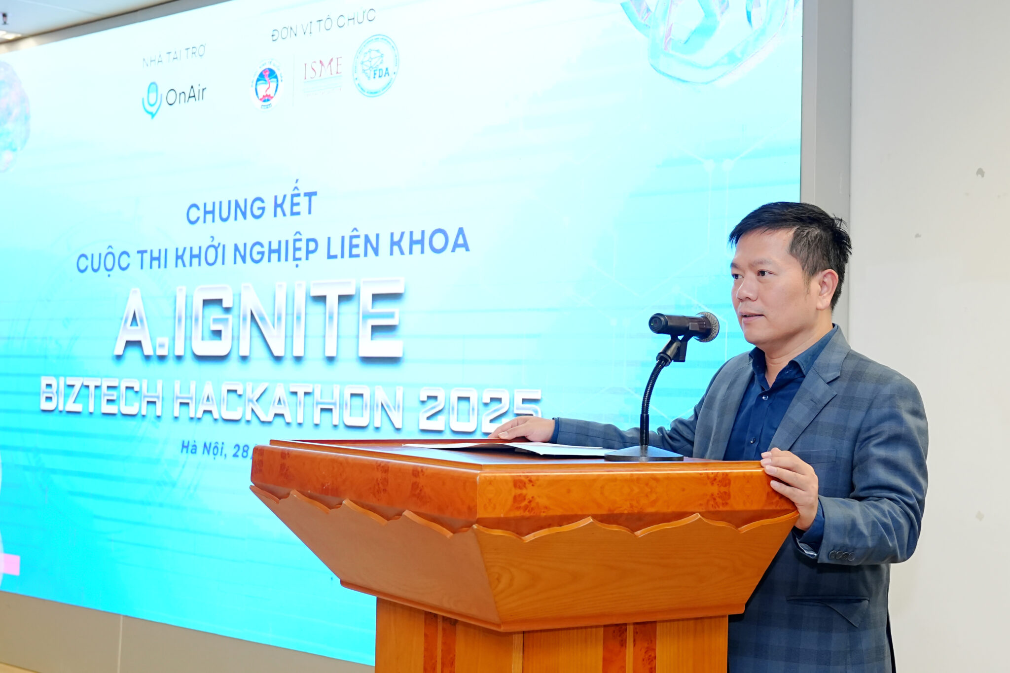 Phát biểu khai mạc tại Vòng chung kết cuộc thi, GS.TS Nguyễn Thành Hiếu – Phó Giám đốc Đại học Kinh tế Quốc dân nhấn mạnh về tầm quan trọng của công nghệ trong kinh doanh, và cho hay “hôm nay, chúng ta cùng chứng kiến vòng chung kết BizTech Hackathon 2025 – A.Ignite, một sân chơi sáng tạo dành cho những ý tưởng đột phá, thúc đẩy tinh thần khởi nghiệp và hợp tác liên ngành trong thời đại công nghiệp 4.0. Cuộc thi không chỉ giúp sinh viên thử sức với công nghệ tiên tiến mà còntạo cơ hội kết nối tri thức, ứng dụng vào thực tiễn, mang lại giá trị cho cộng đồng. Một trong những mục tiêu quan trọng nhất của cuộc thi là xây dựng cầu nối giữa các lĩnh vực, giúp sinh viên mở rộng góc nhìn, học hỏi từ nhau và phát triển mạng lưới chuyên nghiệp”.