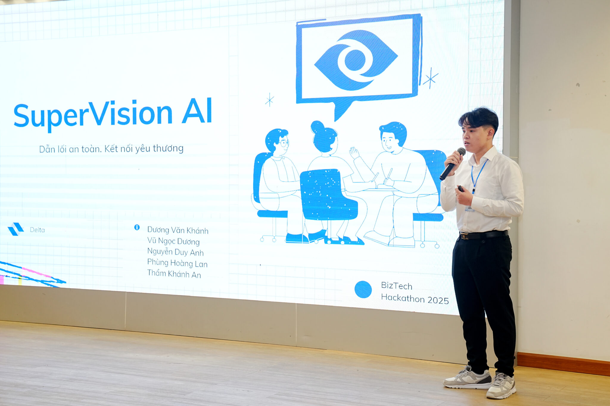 Đội Delta bước vào vòng chung kết với Supervision – ứng dụng AI hỗ trợ người khiếm thị nhận diện văn bản, tiền tệ, màu sắc, vật thể và chỉ đường qua giọng nói. Supervision giải quyết khó khăn trong nhận diện và di chuyển, khắc phục hạn chế của các ứng dụng nước ngoài và cung cấp trợ lý giọng nói thông minh. Ứng dụng giúp người khiếm thị đọc tài liệu, xác định môi trường xung quanh, di chuyển an toàn với Google Maps và tương tác dễ dàng hơn, góp phần nâng cao chất lượng cuộc sống và sự độc lập của họ.