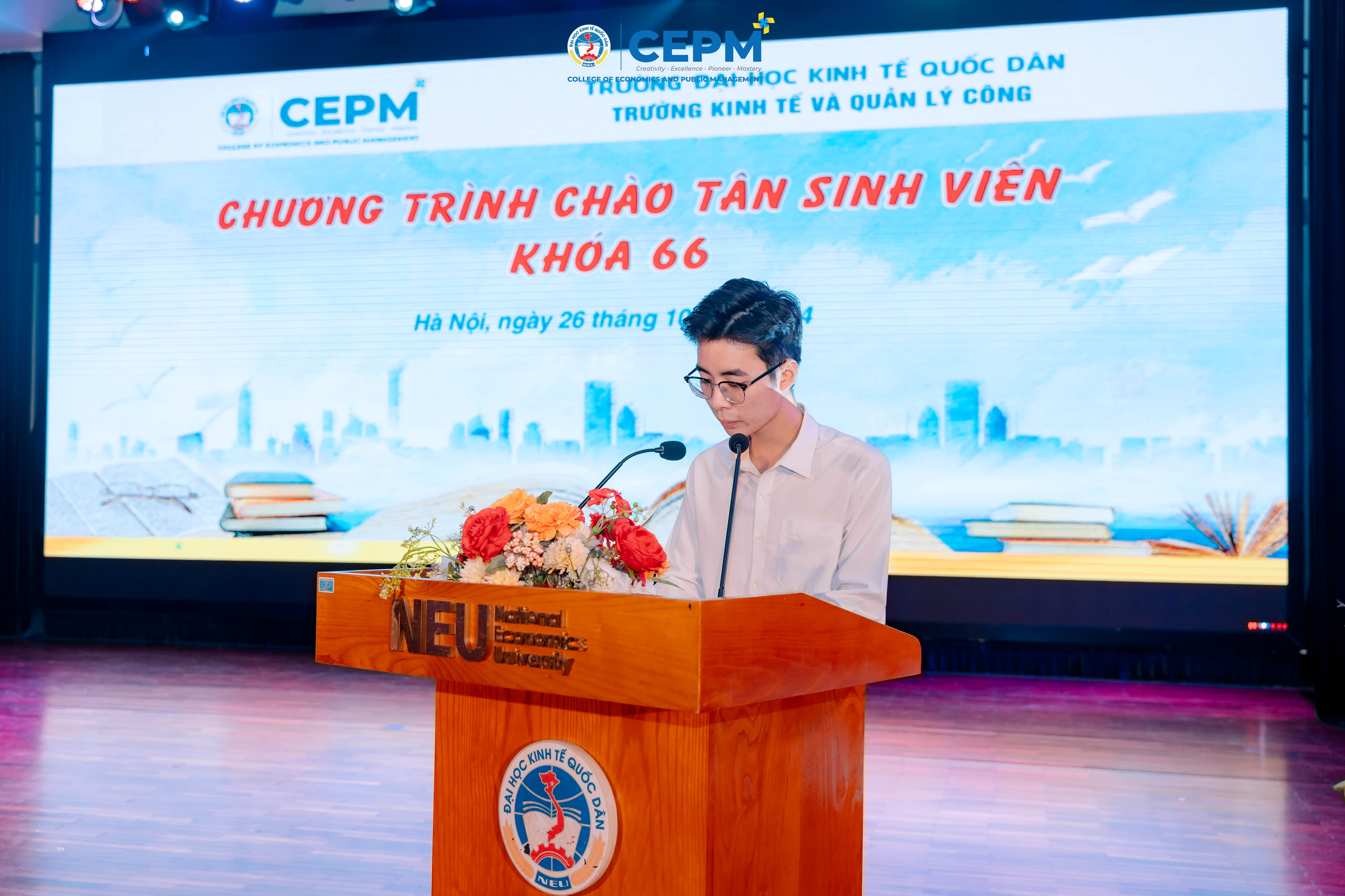 Thay mặt các bạn tân sinh viên khóa 66, em Nguyễn Đình Vũ – sinh viên khoá 66 ngành Khoa học quản lý phát biểu bày tỏ niềm tự hào khi được gia nhập vào cộng đồng sinh viên Trường Kinh tế và Quản lý công. Em chia sẻ kỳ vọng về một môi trường học tập hiện đại, sáng tạo và đầy nhiệt huyết, nơi các bạn không chỉ hoàn thiện kiến thức chuyên môn mà còn trưởng thành qua những hoạt động ngoại khóa, nghiên cứu khoa học. Em cũng đại diện các tân sinh viên gửi lời cảm ơn sâu sắc đến Ban Giám hiệu, các thầy cô và anh chị sinh viên đã hỗ trợ nhiệt tình trong những ngày đầu nhập học, đồng thời cam kết sẽ nỗ lực học tập, rèn luyện để đóng góp vào sự phát triển của nhà trường và xã hội