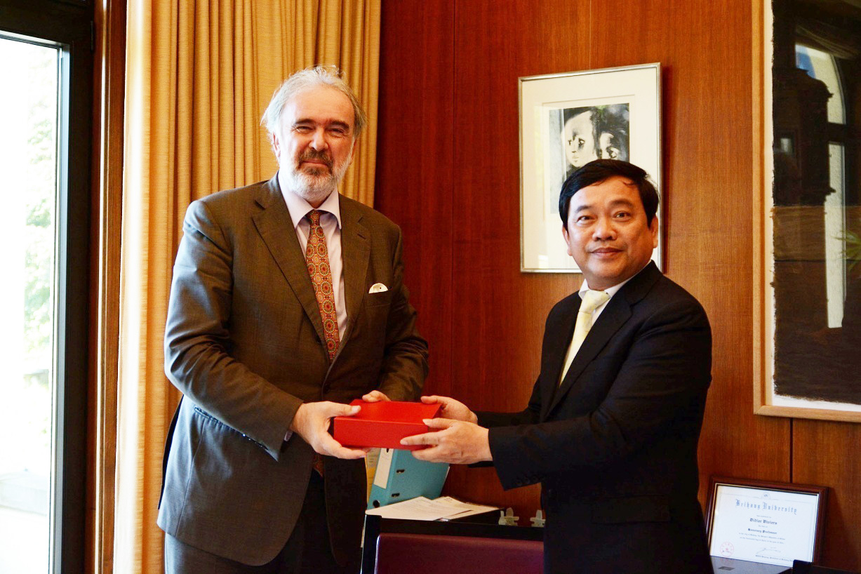 GS. Hiệu trưởng Trần Thọ Đạt trao quà lưu niệm cho GS. Didier Viviers,