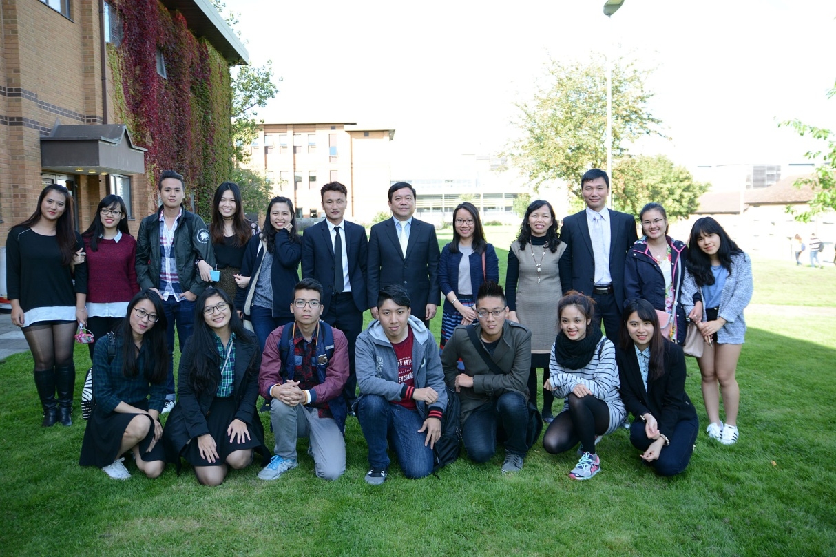 GS. Hiệu trưởng Trần Thọ Đạt và Đoàn công tác chụp ảnh lưu niệm cùng với các sinh viên và cựu sinh viên IBD đang học tập và nghiên cứu tại Vương Quốc Anh