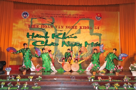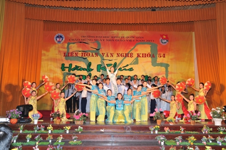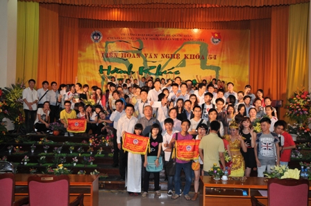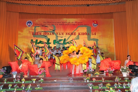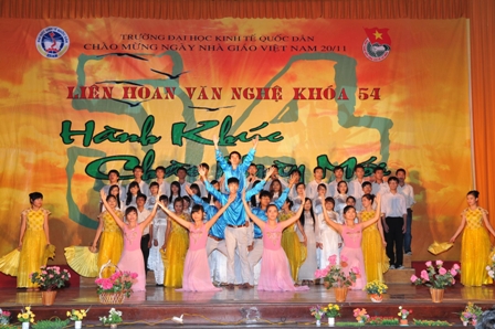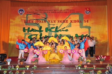 Sau 3 đếm sơ khảo diễn ra khá sôi nổi vào các tối thứ 2, thứ 3, thứ 4 ( ngày 5,6,7/11/2012, tối thứ 7 ngày 10/11, tại nhà văn hoá trường, đêm công diễn và trao giải Liên hoan tiếng hát sinh viên khoá 54 đã diễn ra khá tưng bừng với sự hiện diện của GS.TS Nguyễn Văn Nam, Hiệu trưởng – Bí thư Đảng uỷ, GS.TS Phan Công Nghĩa, Phó Hiệu trưởng – Trưởng Ban chỉ đạo liên hoan; GS.TS Phạm Quang Trung- Phó Hiệu trưởng; PGS.TS Đào Thị Phương Liên- Chủ tịch CĐ; GS.TS Nguyễn Quang Dong, Trưởng phòng QLĐT; PGS.TS Nguyễn Thanh Hà, Trưởng phòng TH; PSG.TS Ngô Văn Thứ, Phó Chủ tịch CĐ…cùng các Thầy, Cô lãnh đạo Khoa, Viện, Trung tâm, Tổ chức chính trị trong toàn trường và đông đảo sinh viên khoá 54, các khoá trước đến động viên, cổ vũ.