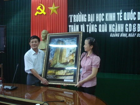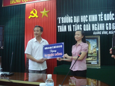 Chia tay trường THPT Nguyễn Hữu Cảnh chúng tôi tiếp tục cuộc hành trình quay về Sở GD và ĐT tỉnh để trao 70 triệu đồng cho Sở. Giám đốc và nhiều đại diện các phòng, ban của Sở GD tỉnh Quảng Bình đã đến dự và chứng kiến buổi lễ trao tặng quà. Thay mặt toàn thể Cán bộ, Giáo viên, đ/c Đoàn Đức Liêm – Giám đốc Sở giáo dục đã tiếp nhận và phát biểu cảm ơn, ghi nhận những tình cảm quý báu của Ban Giám hiệu, các thầy cô giáo, cán bộ trường ĐHKTQD đã dành cho tỉnh Quảng Bình. Đây là một món quà đầy ý nghĩa đối với sự phát triển giáo dục của tỉnh Quảng Bình; đồng thời hứa sẽ sử dụng số tiền đúng mục đích, đúng đối tượng, hiệu quả và thiết thực, và hy vọng trong thời gian tới ngành Giáo dục tỉnh Quảng Bình tiếp tục nhận được sự quan tâm nhiều hơn nữa của các đơn vị, các doanh nghiệp, các nhà hảo tâm trong cả nước nói chung, của Trường Đại học Kinh tế Quốc dân nói riêng.