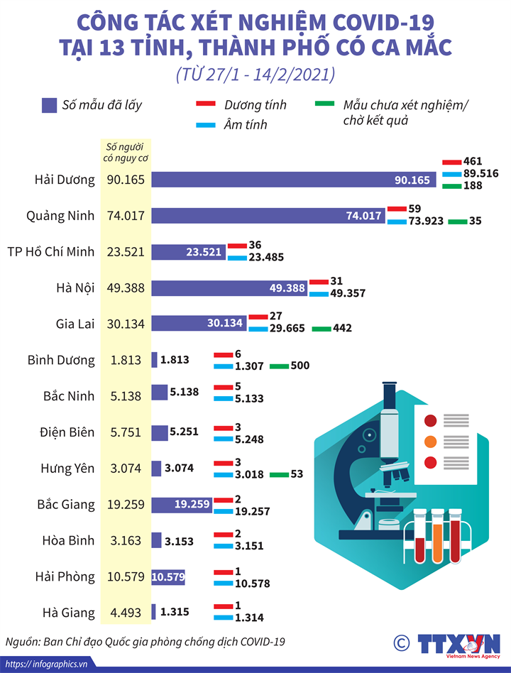 Công tác xét nghiệm COVID-19 tại 13 tỉnh, thành phố có ca mắc (từ 27/1 – 14/2/2021)