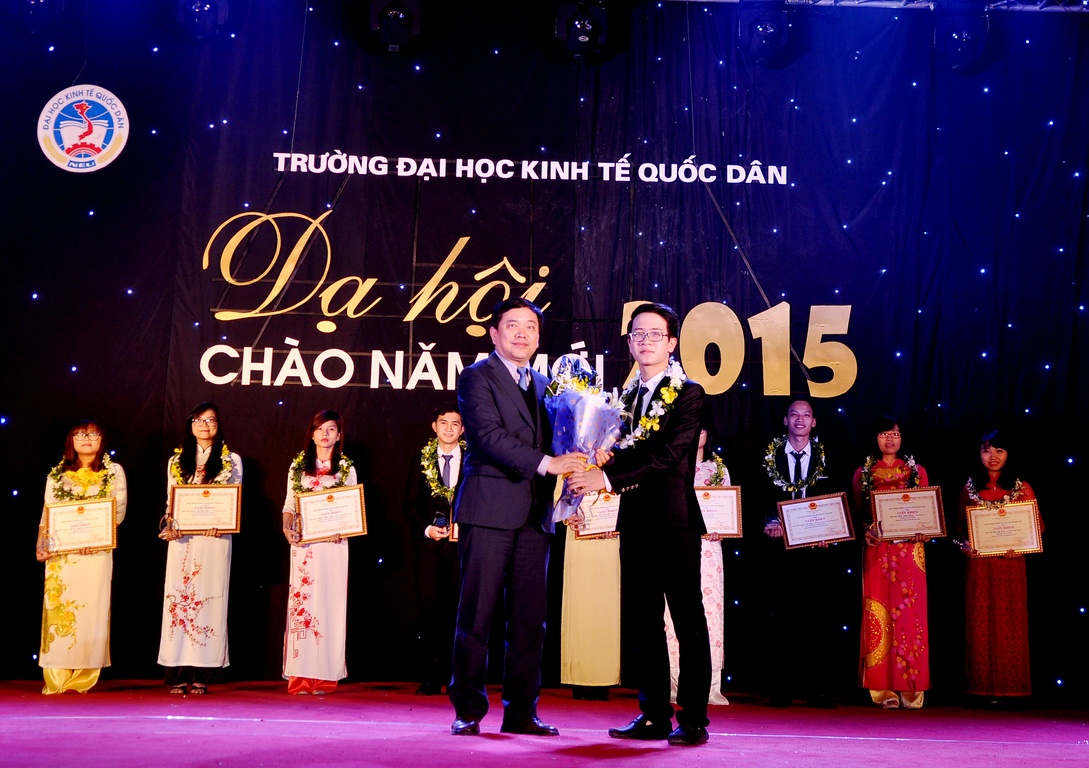 Chương trình dạ hội Chào năm mới 2015 được chính thức bắt đầu khi GS.TS.Trần Thọ Đạt – Bí thư Đảng ủy, Hiệu trưởng phát biểu như một thông điệp đầu năm. Với tâm huyết của người đứng đầu Nhà trường, Bí thư Hiệu trưởng Trần Thọ Đạt cho rằng năm 2014 vừa qua là một năm gặt hái được nhiều thành công nhưng cũng còn nhiều khó khăn, thử thách. Tuy vậy, bằng truyền thống tốt đẹp, những kinh nghiệm quý báu của một ngôi trường Đại học hàng đầu về kinh tế đang hướngvề dịp kỉ niệm 60 năm ngày thành lập, chúng ta có quyền tự hào về những gì đạt được. Trong năm tiếp theo 2015 sẽ là rất nhiều thuận lợi và cũng không ít những khó khăn thử thách mới, nhưng Giáo sư Hiệu trưởng tin tưởng với trí tuệ, tình cảm và trách nhiệm của tất cả những cán bộ giảng viên đang công tác, giảng dạy cũng như các em sinh viên đang học tập dưới mái trường ĐH Kinh tế Quốc dân đầy tự hào và yêu thương, chúng ta sẽ cùng nhau vượt qua những khó khăn thách thức để đạt được những thành công mới. Trong giờ phút cuối năm, thay mặt Đảng ủy, BGH Nhà trường, Giáo sư Hiệu trưởng gửi lời cảm ơn chân tình đến các Thầy, Cô giáo, các cán bộ và viên chức, đến các em sinh viên, học viên, Nghiên cứu sinh về những cống hiến của mọi người cho sự phát triển của Nhà trường trong năm vừa qua. Giáo sư Hiệu trưởng tin rằng bằng sự nhiệt tình, ý thức trách nhiệm và tình yêu với mái Trường Đại học KTQD sẽ là động lực quan trọng giúp chúng ta tin tưởng, đoàn kết vì một năm mới 2015 thành công và đạt được nhiều điều tốt đẹp hơn. Nhân dịp năm mới 2015 và mùa xuân mới đang tới gần, thay mặt cho Đảng ủy, BGH Nhà trường, Giáo sư Hiệu trưởng gửi đến các thầy cô giáo, các vị đại biểu và toàn thể các em sinh viên, học viên, NCS đang học tập tại trường những lời chúc mừng tốt đẹp nhất, sức khỏe, hạnh phúc và thành công trên từng cương vị công tác và học tập.
