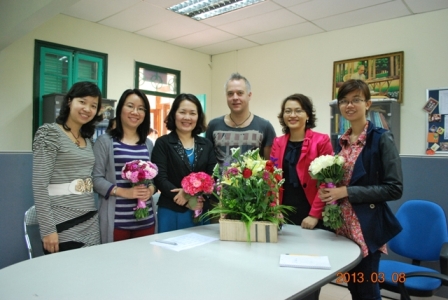 Ông Timothy Hinks tặng hoa các nữ cán bộ Viện ĐTQT nhân dịp 8/3