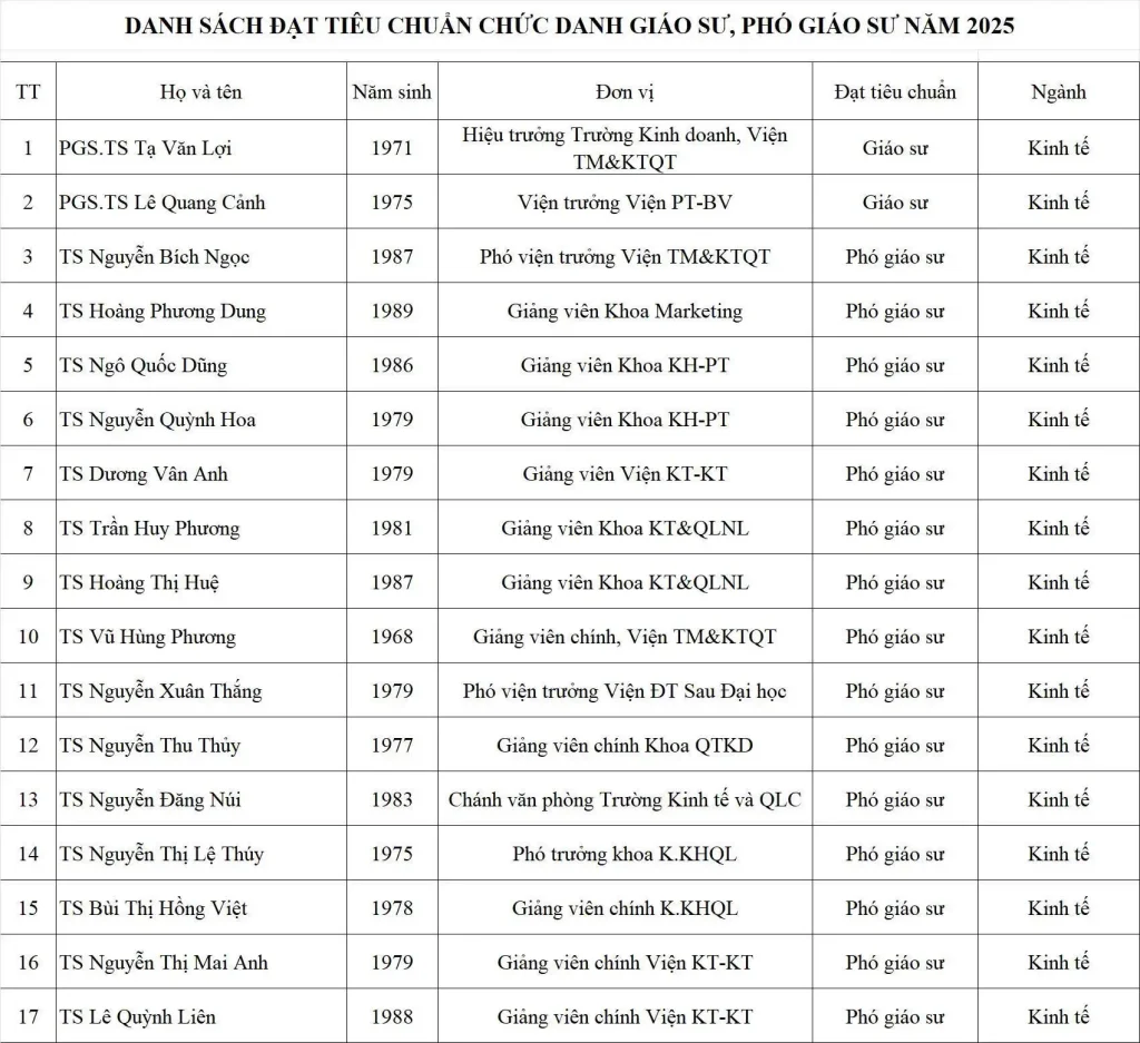 Danh sách nhà giáo được công nhận đạt tiêu chuẩn chức danh giáo sư, phó giáo sư Đại học Kinh tế Quốc dân năm 2025