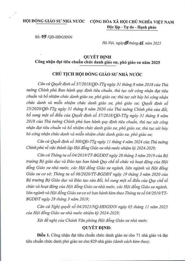 Hội đồng Giáo sư Nhà nước vừa ký quyết định công nhận đạt tiêu chuẩn chức danh giáo sư, phó giáo sư năm 2025 cho 900 ứng viên, trong đó có 71 giáo sư và 829 phó giáo sư. Theo quy định, sau 15 ngày kể từ khi công bố kết quả, nếu không có khiếu nại hoặc phản ánh, Chủ tịch Hội đồng Giáo sư Nhà nước sẽ ký quyết định công nhận và cấp chứng nhận đạt tiêu chuẩn cho các ứng viên.