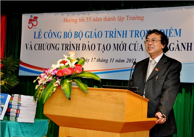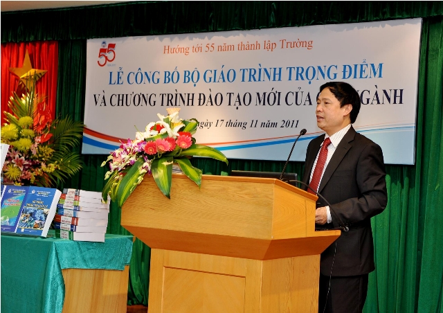 Cùng với GS. TS Phạm Quang Trung – Phó Hiệu trưởng, GS TS Nguyễn Quang Dong – Trưởng Phòng Quản lý đào tạo cắt băng khai trương Bộ giáo trình trọng điểm, GS.TS Nguyễn Văn Nam – Hiệu trưởng đã mở đầu bài phát biểu bằng việc nhắc lại lời chúc của Chủ tịch nước Trương Tấn Sang ( nhân dịp Hiệu trưởng đến mời Chủ tịch nước về dự lễ hội kỷ niệm 55 thành lập trường) : “ Trường đại học Kinh tế quốc dân phải phấn đấu trở thành một Harvard của Việt Nam”. Lời chúc của Chủ tịch nước đồng thời cũng là một trọng trách mà Đảng, Nhà nước giao cho trường. Để thực hiện nhiệm vụ lớn lao này, nhà trường sẽ tập trung phát huy nội lực, tận dụng có hiệu quả ngoại lực để thực hiện công cuộc đổi mới, hội nhập và phát triển trường. Trong đó trước tiên phải đổi mới chương trình đào tạo theo quan điểm mới, hiện đại, tiếp đó phải đổi mới giáo trình học liệu và sau nữa là đổi mới phương pháp giảng dạy. Theo đó các bài giảng phải phong phú hiện đại, thu hút sinh viên, tiến tới xoá bỏ điểm danh, cải tiến thi cử : sinh viên được mang và sử dụng sách trong phòng thi, đề thi mở để kiểm tra khả năng sáng tạo và kỹ năng giải quyết vấn đề của sinh viên… Bộ giáo trình điểm của trường không chỉ được sử dụng trong trường mà sẽ trở thành bộ giáo trình chuẩn của Mạng lưới 40 trường đại học, học viện có đào tạo về kinh tế và kinh doanh của Việt Nam – mạng lưới mà đại học Kinh tế quốc dân là thành viên sáng lập và là Chủ tịch .