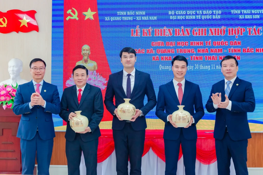Lãnh đạo Đại học Kinh tế Quốc dân và lãnh đạo các xã Quang Trung, Nhã Nam – Tỉnh Bắc Ninh và xã Kha Sơn – Tỉnh Thái Nguyên cùng ký kết Biên bản ghi nhớ hợp tác