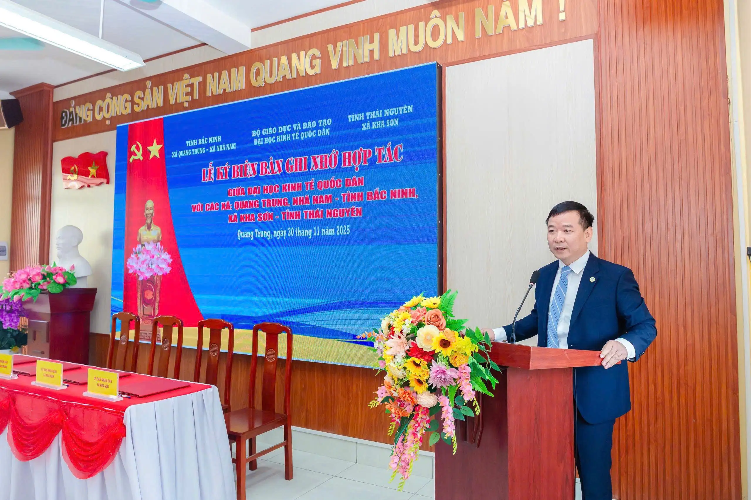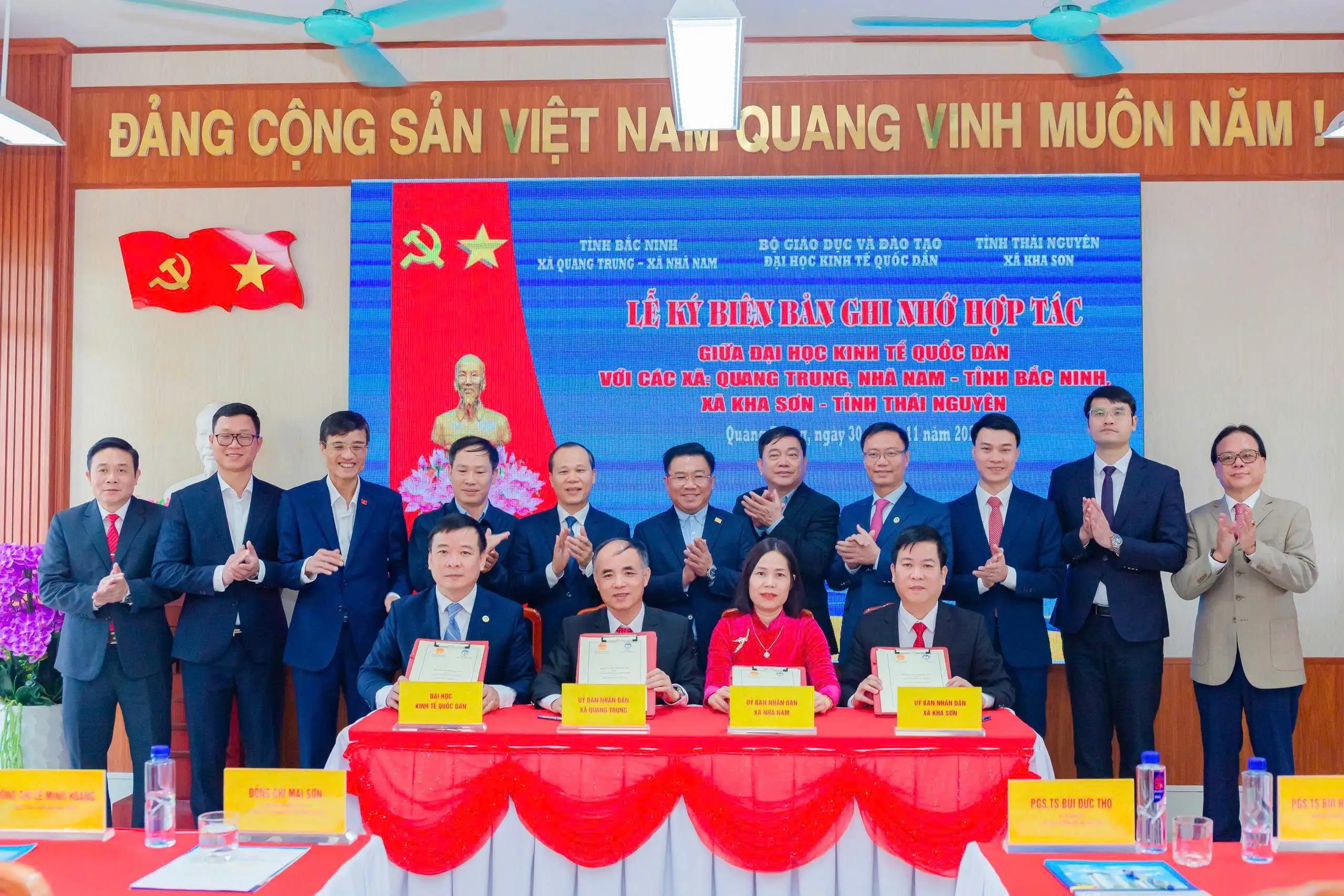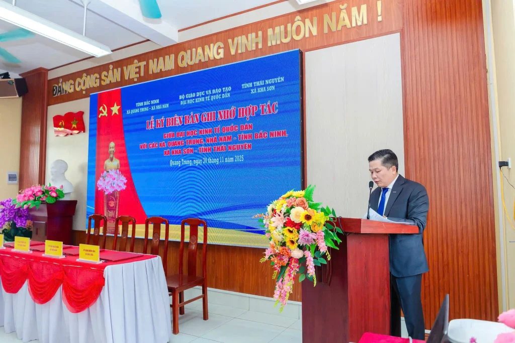 Ngày 30/11/2025, tại xã Quang Trung, tỉnh Bắc Ninh đã diễn ra Lễ ký kết Biên bản ghi nhớ hợp tác giữa Đại học Kinh tế Quốc dân với các xã: Quang Trung, Nhã Nam (tỉnh Bắc Ninh) và Kha Sơn (tỉnh Thái Nguyên). Đây là sự kiện có ý nghĩa đặc biệt, trong chuỗi các sự kiện kỷ niệm 60 năm Đại học Kinh tế Quốc dân về nơi sơ tán.