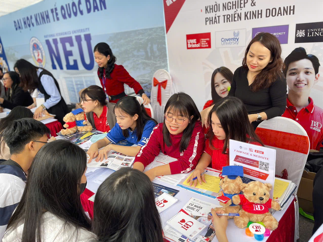 Các cán bộ giảng viên, sinh viên Đại học Kinh tế Quốc dân nhiệt tình giải đáp thắc mắc cho các em học sinh tại chương trình