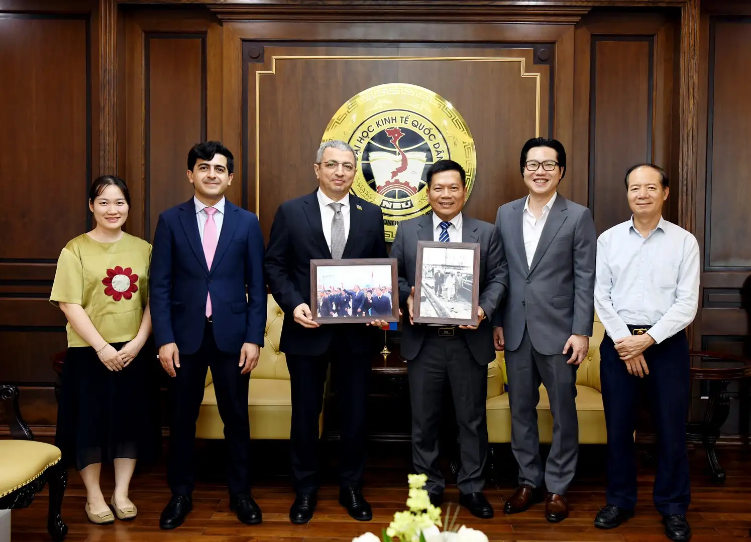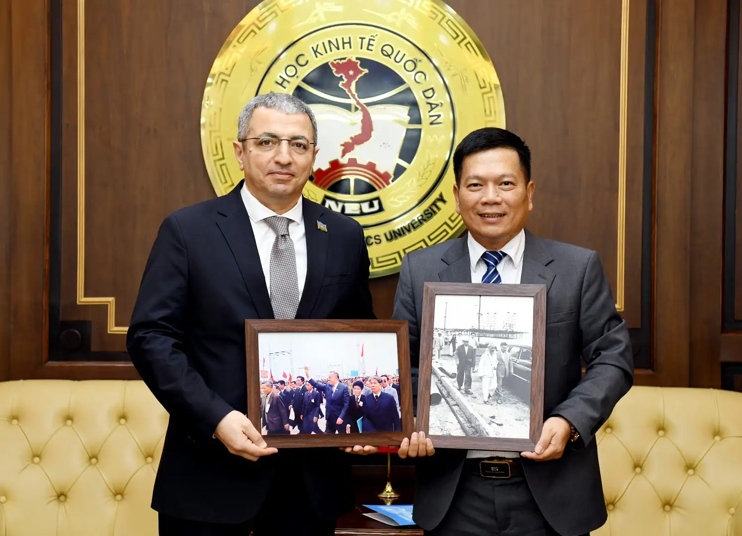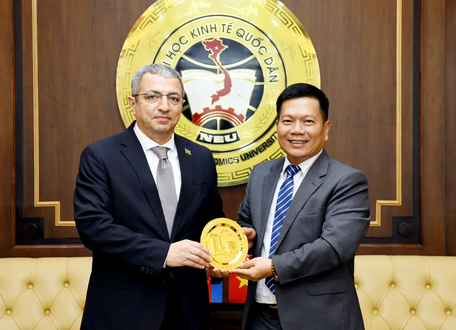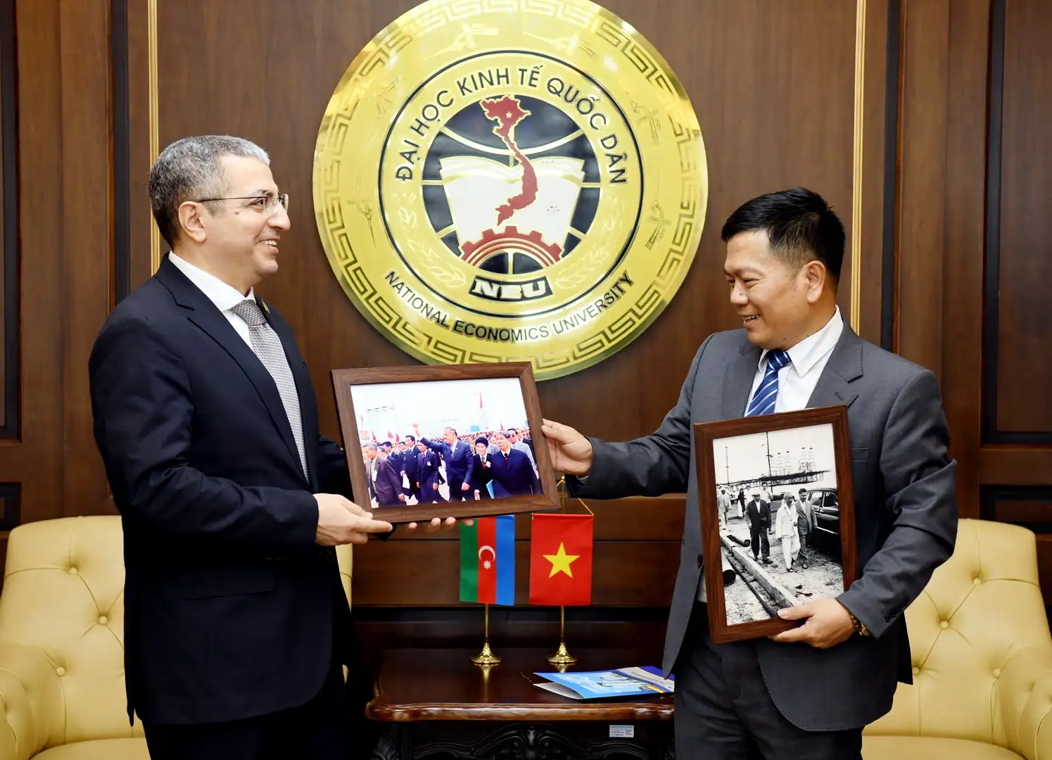 GS.TS Nguyễn Thành Hiếu – Phó Giám đốc Đại học Kinh tế Quốc dân cùng ngài Shovgi Kamal Oglu Mehdizade – Đại sứ Đặc mệnh toàn quyền Azerbaijan tại Việt Nam trao quà và chụp ảnh lưu niệm