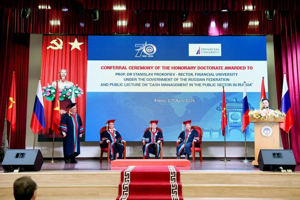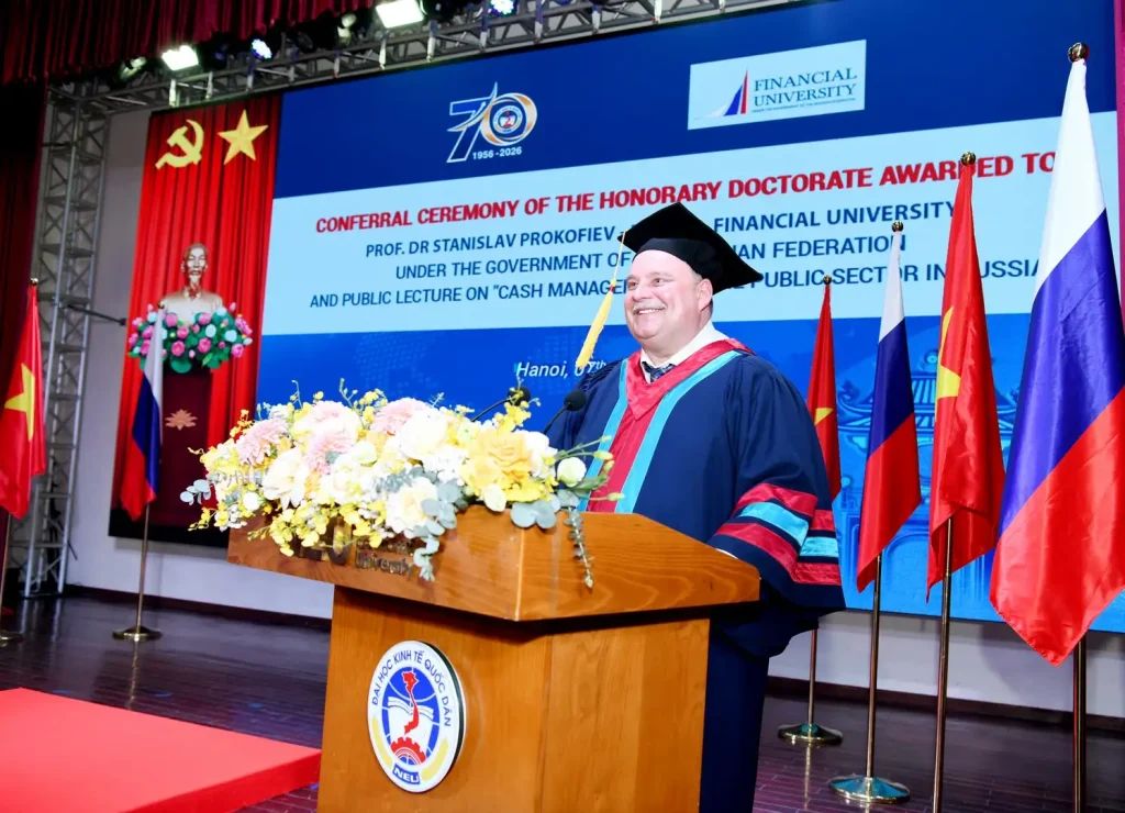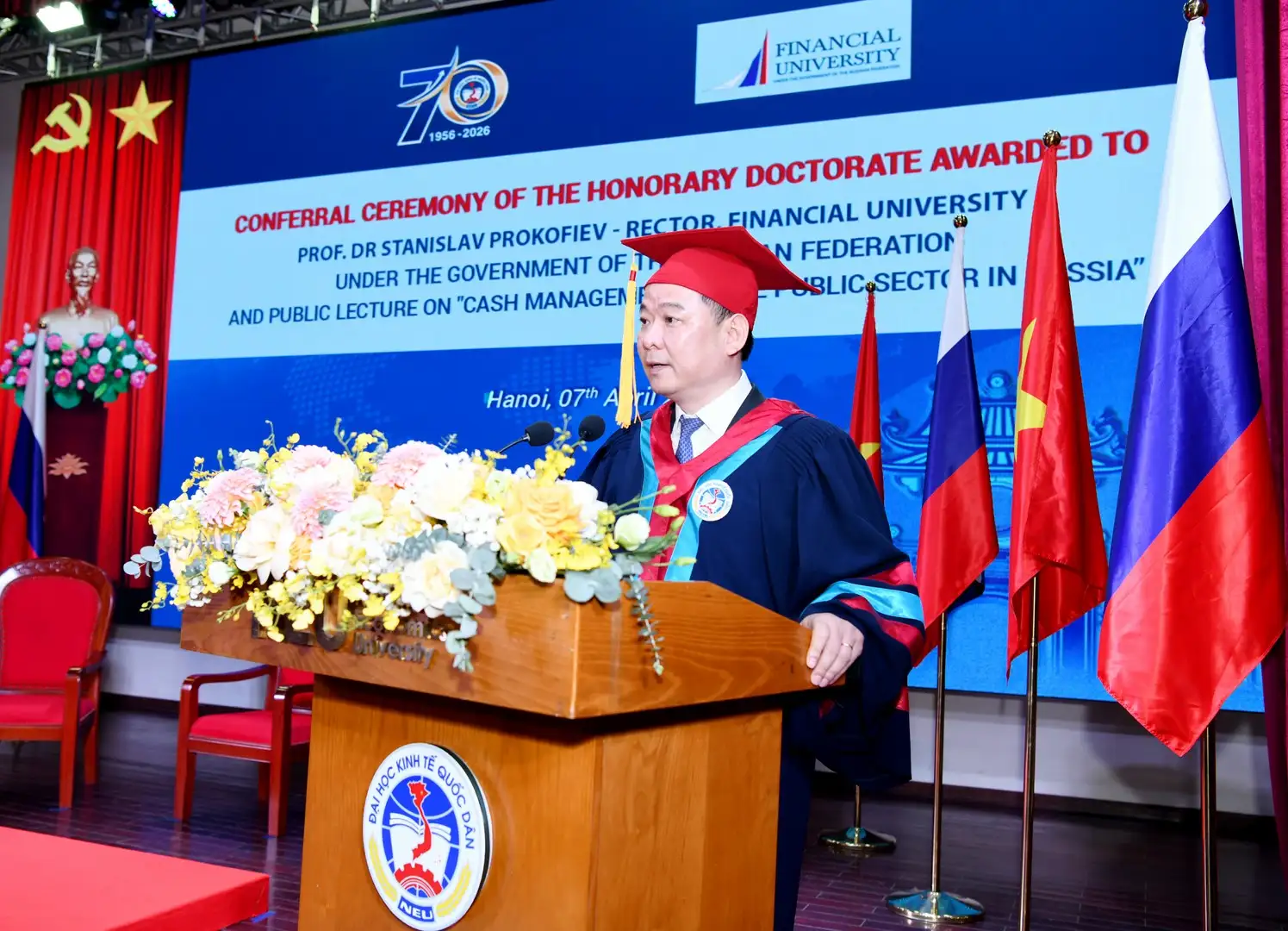 Chiều 07/4/2026, Đại học Kinh tế Quốc dân tổ chức lễ trao bằng Tiến sĩ Danh dự cho GS.TS Stanislav Evgenievich Prokofiev – Hiệu trưởng Trường Đại học Tài chính trực thuộc Chính phủ Liên Bang Nga.