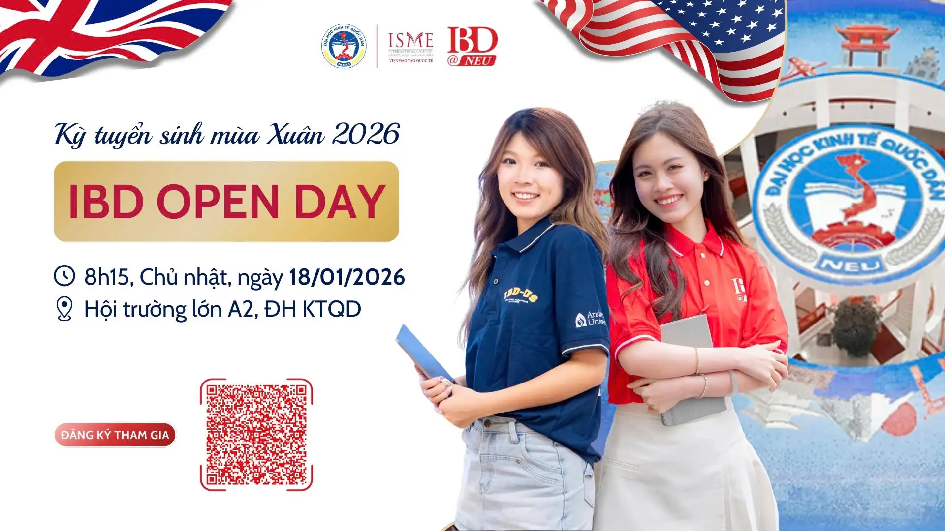 Viện Đào tạo Quốc tế, Đại học Kinh tế Quốc dân trân trọng kính mời quý vị phụ huynh và học sinh quan tâm tới tham dự Ngày hội Giới thiệu thông tin tuyển sinh chương trình Cử nhân Quốc tế IBD@NEU – IBD OPEN DAY kỳ Xuân 2026 vào sáng Chủ nhật, ngày 18/01/2026 Thời gian: 08h15 – 12h, Chủ Nhật, ngày 18/01/2026 Địa điểm: Hội trường A2 – Trường Đại học Kinh tế Quốc dân, 207 Giải Phóng, Hà Nội Đăng ký tham gia: Với chủ đề: “Đại học – Khám phá và Trải nghiệm”, 𝐈𝐁𝐃 𝐎𝐏𝐄𝐍 𝐃𝐀𝐘 mang đến cho học sinh và phụ huynh loạt hoạt động hấp dẫn: Cập nhật thông tin tuyển sinh mới nhất kỳ mùa Xuân 2026 Lớp học trải nghiệm các ngành học: Quản trị; Ngân hàng & Tài chính; Marketing Nhận tài liệu thi thử đầu vào tiếng Anh & Kiến thức Tổng hợp Tư vấn chuyên sâu cùng giảng viên, cán bộ & sinh viên chương trình Tham quan – Giao lưu – Trải nghiệm không khí học tập chuẩn quốc tế Chi tiết sự kiện:  Tìm hiểu ngay tại 𝐈𝐁𝐃 𝐎𝐏𝐄𝐍 𝐃𝐀𝐘: Khám phá hành trình đại học quốc tế ngay tại Việt Nam Hiểu rõ lộ trình học, cơ hội du học, việc làm và phát triển bản thân Trực tiếp trải nghiệm không khí học tập, văn hóa sinh viên tại IBD@NEU