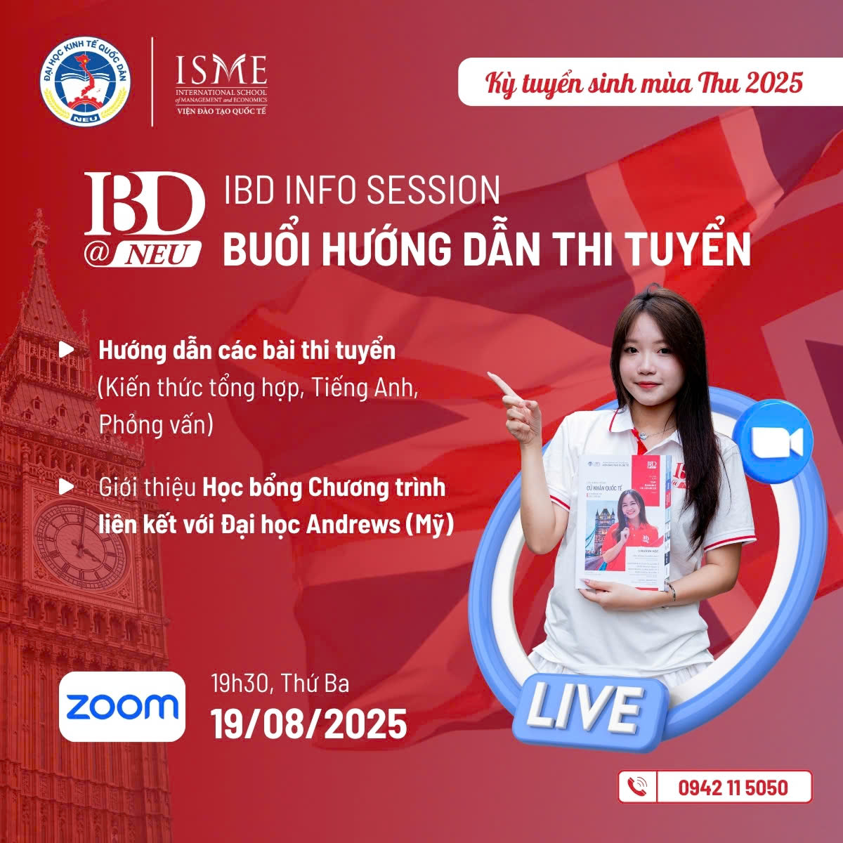 Viện Đào tạo Quốc tế – Đại học Kinh tế Quốc dân tổ chức Buổi Hướng dẫn Thi tuyển và Giới thiệu Học bổng – IBD Info Session online. IBD Info Session mang đến cơ hội tìm hiểu về Các bài thi tuyển đầu vào Chương trình IBD@NEU và Học bổng Chương trình liên kết với Đại học Andrews (Mỹ). Thời gian: 19h30 – 21h, ngày 19/8/2025 Hình thức: Online qua Zoom  Khung chương trình: 19h30 – 19h45: Giới thiệu Học bổng Chương trình IBD liên kết với Đại học Andrews (Mỹ) 19h45 – 20h15: Hướng dẫn các bài Thi tuyển đầu vào (Kiến thức Tổng hợp, Tiếng Anh và Phỏng vấn) 20h15 – 21h: Tư vấn và Hỏi đáp Cách tham gia Buổi giới thiệu thông tin: Vào qua nền tảng Zoom Meeting: Nhấn trực tiếp vào link: https://zoom.us/j/97493045637 Lưu ý: Sự kiện chỉ được mở online từ 18h55 ngày 19/8/2025 Đối với việc tham gia Meeting trên điện thoại, người dùng cần cài đặt ứng dụng Zoom trước khi nhấn vào đường link Nếu cần sự hỗ trợ và giúp đỡ trong quá trình tham gia Info Session, vui lòng hãy liên hệ hotline 0942115050