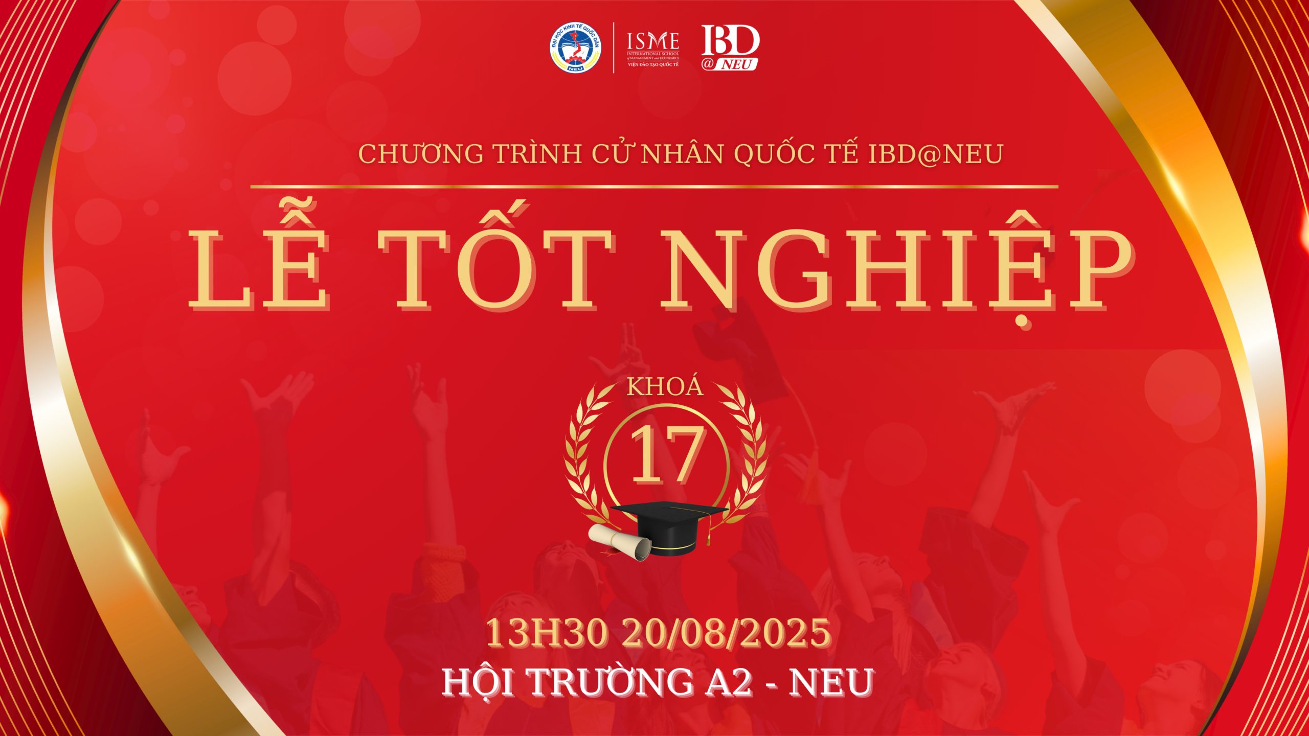 Hành trình bốn năm tuổi trẻ của Sinh viên IBD khóa 17 đã khép lại tại mái nhà Viện Đào tạo Quốc tế. Sẽ có những niềm hân hoan trước chặng đường mới, có cả những sự tiếc nuối khi đứng trước ngã rẽ của cuộc đời; nhưng, sự kết thúc này chính là khởi đầu mới đầy tươi sáng và nhiều trải nghiệm mới của các Tân Cử nhân. Chắc hẳn các bạn sẽ không thể quên những ngày tháng tuổi trẻ cùng gắn bó, phát triển và trưởng thành bên nhau. Tất cả những kỷ niệm ấy sẽ được lưu lại tại Lễ tốt nghiệp dành cho sinh viên khoá 17 tại Chương trình Cử nhân Quốc tế IBD@NEU. Xin chúc mừng các Tân cử nhân đã xuất sắc hoàn thành chương trình học tại IBD@NEU. Chúc các bạn sẽ gặt hái được nhiều thành công trên con đường mình chọn. Viện ĐTQT trang trọng tổ chức Lễ tốt nghiệp Chương trình IBD@NEU Khóa 17 dành cho các sinh viên ngành Ngân hàng và Tài chính, ngành Quản trị Kinh doanh Quốc tế (ĐH West of England, VQ Anh) và ngành Kinh doanh và Marketing (ĐH Coventry, VQ Anh) Thời gian: 13h30 –  20/8/2025 Địa điểm: Hội trường lớn – toà A2 – Đại học Kinh tế Quốc dân Xin trân trọng kính mời Quý vị Phụ huynh, các bạn sinh viên cùng đến tham dự và chúc mừng các Tân Cử nhân.