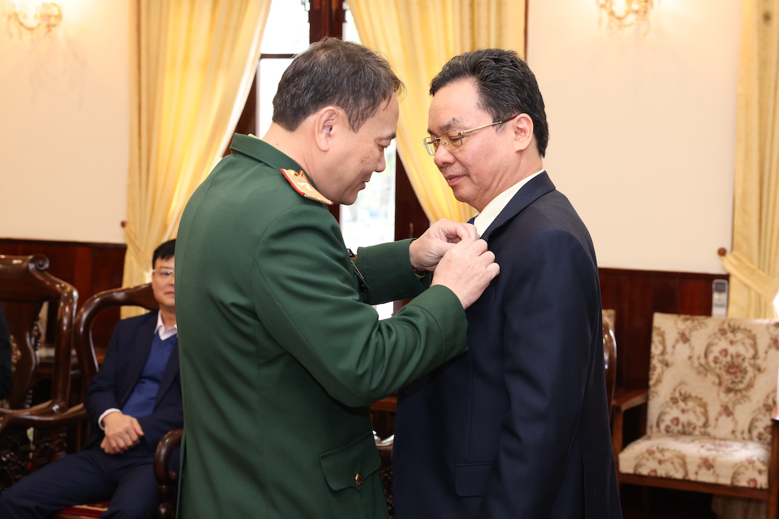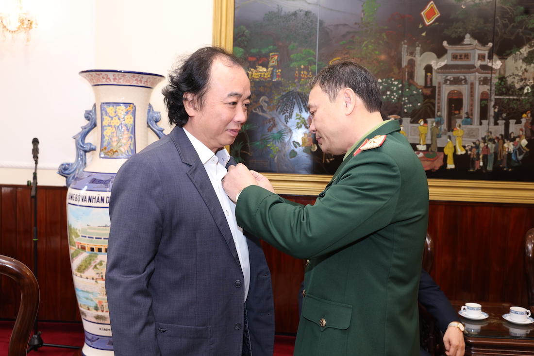 Lãnh đạo Bộ Tư lệnh Bảo vệ Lăng gắn tặng Huy hiệu Bác Hồ cho các đại biểu