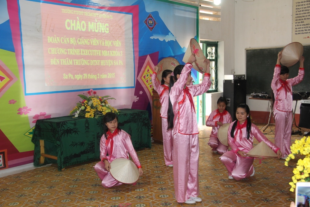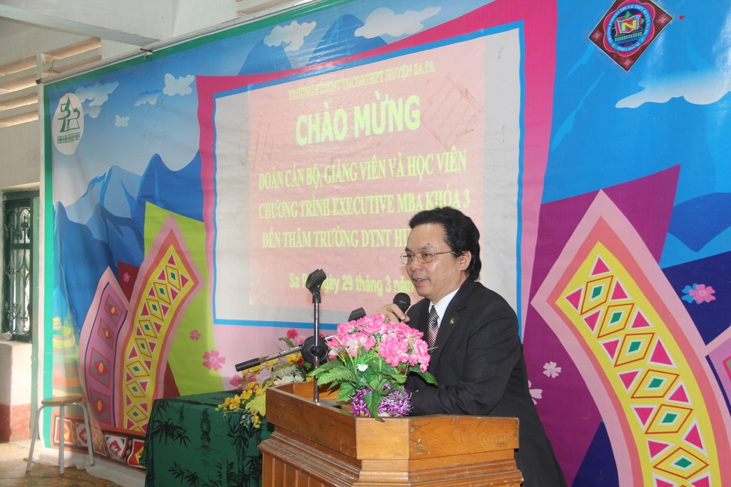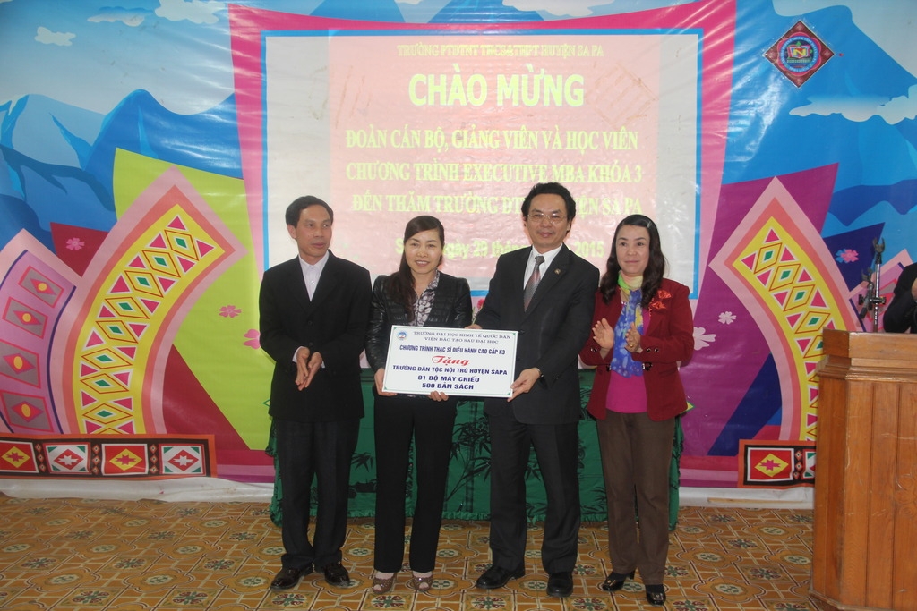 Cuối đợt học, PGS. TS Hoàng Văn Cương, Phó hiệu trưởng Nhà trường, các thày cô giáo và các học viên của Chương trình đã có buổi giao lưu và tặng quà từ thiện hết sức ý nghĩa cho Trường THPT – THCS Dân tộc Nội trú Sapa. Trong buổi tiếp đón trọng thị, thân tình này, về phía địa phương có Ông Nguyễn Ngọc Hinh, Phó Chủ tịch UBND huyện Sapa, ông Lê Xuân Hạ, Phó Hiệu trưởng phụ trách, Bà Nguyễn Thị Phương, Bí thư Đảng ủy, Phó Hiệu trưởng Nhà trường cùng toàn thể lãnh đạo, giảng viên và trên 300 học sinh nhà trường. Đại diện cho Trường Đại học Kinh tế quốc dân và Ban Điều hành Chương trình, PGS. TS Hoàng Văn Cường và các thày, cô giáo, đại diện học viên đã trao tặng 530 đầu sách, một máy Datashow cho trường DTNT Sapa và 24 xuất học bổng trị giá 24 triệu cho các học sinh khó khăn, học giỏi của Nhà trường.