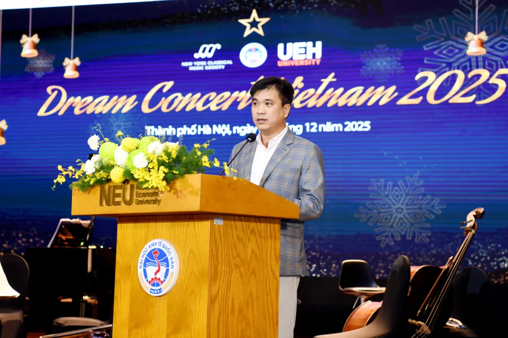 Phát biểu khai mạc chương trình, GS.TS Nguyễn Thành Hiếu chia sẻ, Đại học Kinh tế Quốc dân vinh dự trở thành điểm dừng chân thứ hai trong chuyến lưu diễn của chương trình hòa nhạc cổ điển “Dream Concert Vietnam 2025”, sự kiện nghệ thuật quy mô lớn với sự tham gia của các nghệ sĩ quốc tế đến từ Hiệp hội Âm nhạc Cổ điển New York.
