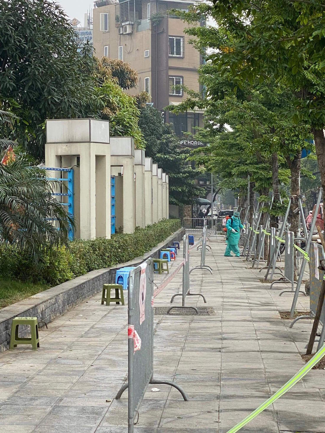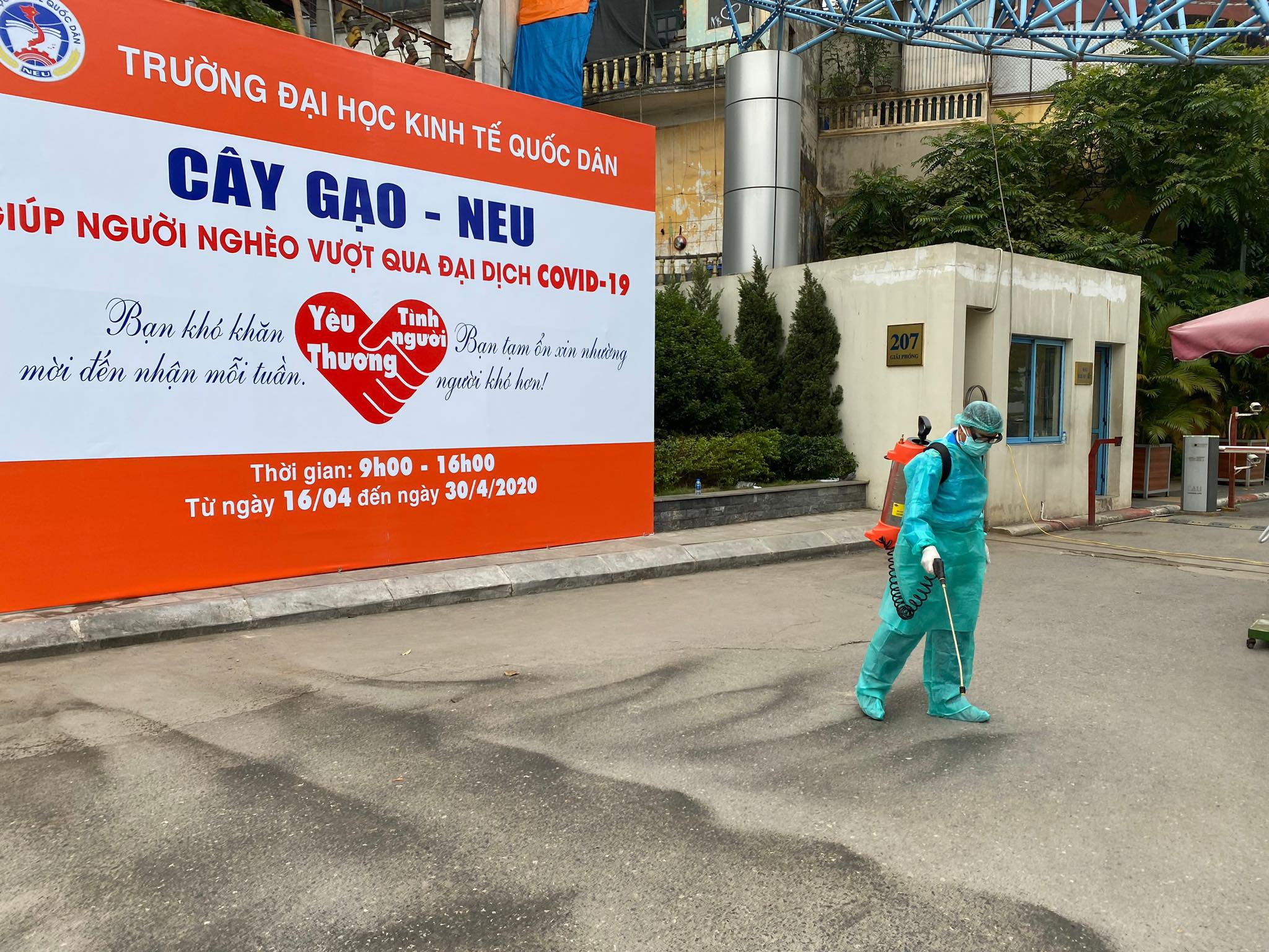 Lực lượng y tế dự phòng của quận phun khử khuẩn toàn bộ khu vực vỉa hè đường Giải Phóng bên ngoài khuôn viên của trường hàng ngày sau khi kết thúc chương trình