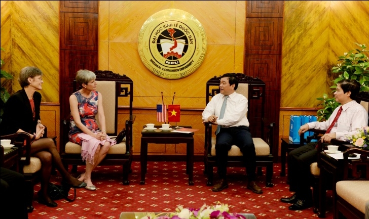 Đón tiếp GS Nancy Napier và Bà Susan Hosley, về phía trường ĐH KTQD có GS.TS Trần Thọ Đạt – Hiệu trưởng, Bí thư Đảng ủy; GS.TS Phạm Quang Trung – Phó Hiệu trưởng cùng các cán bộ giảng viên là cựu học viên của Dự án Sida MBA.