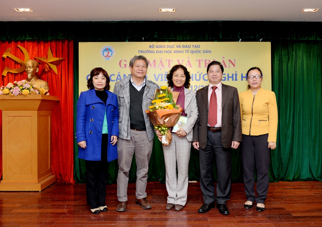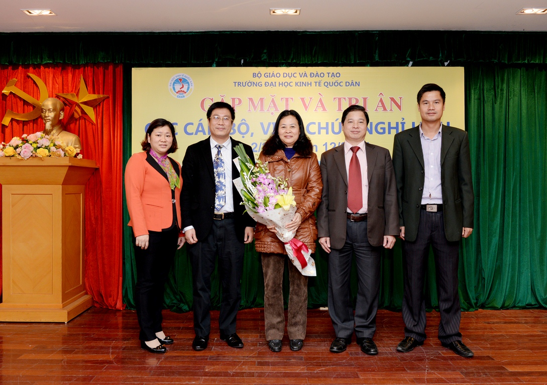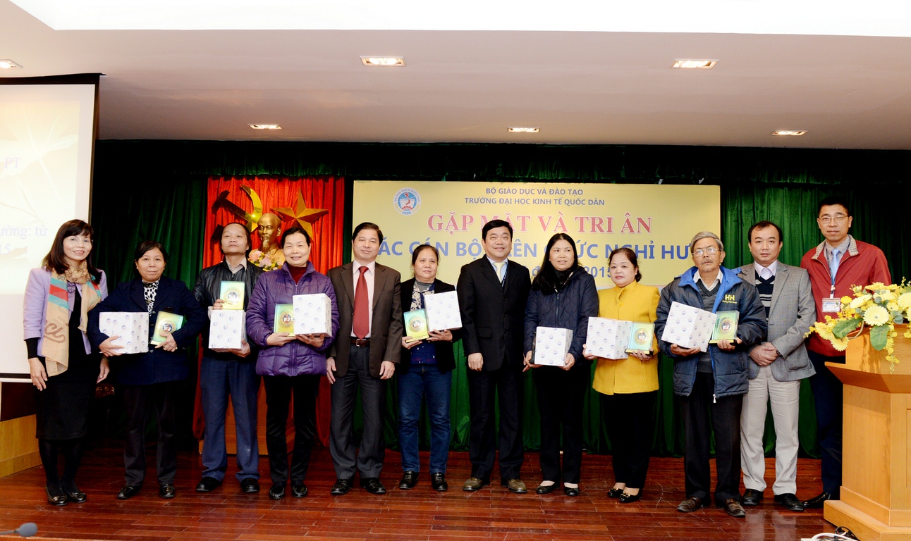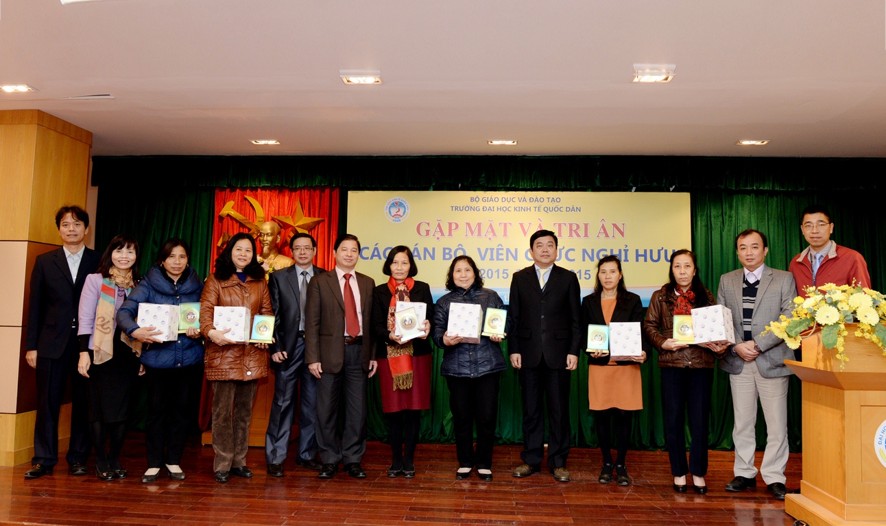 Ngày 15/12/2015, lãnh đạo trường Đại học Kinh tế quốc dân (ĐH KTQD) đã tổ chức buổi gặp mặt thân mật với 23 cán bộ, viên chức được nghỉ theo chế độ từ tháng 2/2015 đến hết tháng 12/2015. Nhiều năm gắn bó với sự nghiệp giáo dục, cống hiến và tâm huyết, những cán bộ, viên chức này đã góp phần tạo nên bề dày lịch sử gần 60 năm của trường ĐH KTQD.